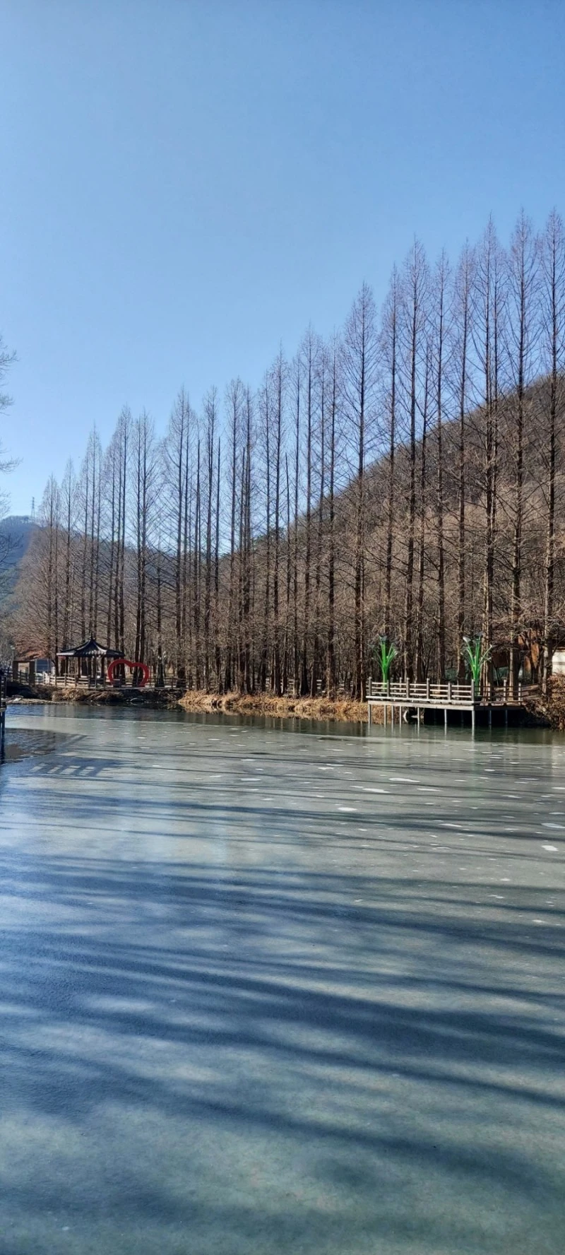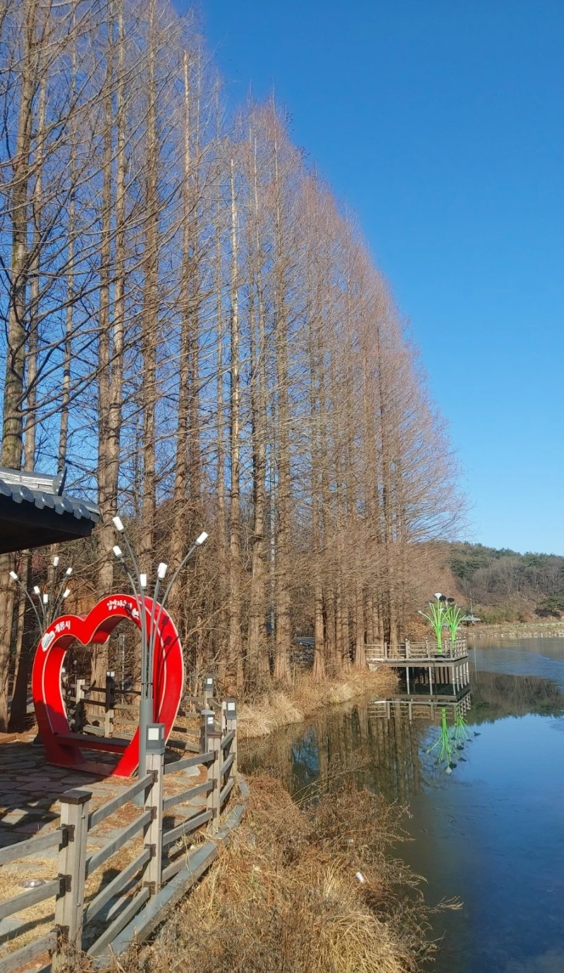 그래도 날이 따스해서 호수 주변으로 조성된 데크길을 따라 걸으며 호젓한 풍경을 만끽할 수 있었답니다. 호수 주변에는 사진 찍기 좋은 조형물도 있고, 쉬었다 갈 수 있는 정자와 의자도 중간중간 마련되어 있어요.