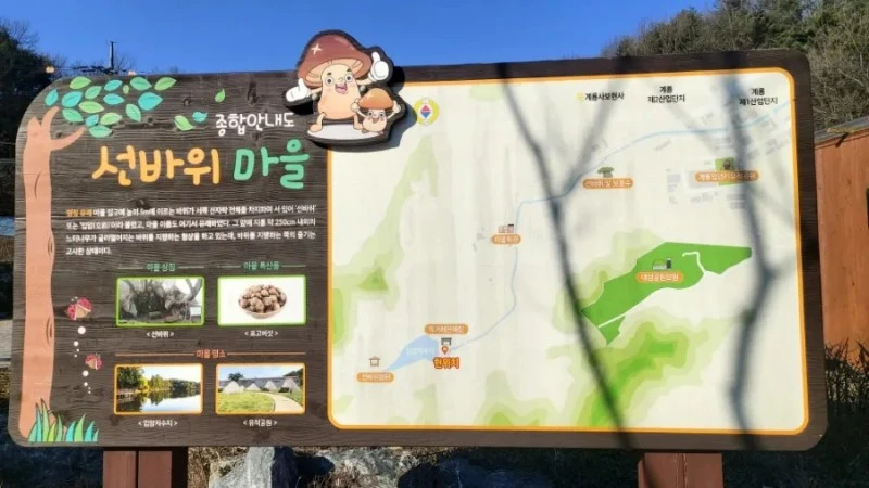이 선바위를 찾으려고 저수지를 도는 동안 주변을 꼼꼼히 살폈는데도 안 보여서 어디에 있는 거야? 하며 궁금했는데 나중에 화장실 다녀와서야 알았어요. 주차장 화장실 뒤편에 있는 마을 지도와 안내판이 있는데요, 그걸 보고서야 선바위는 입암저수지하고는 뚝 떨어져있는 마을 입구에 있다는 사실을 알고 찾아가 보게 되었어요.