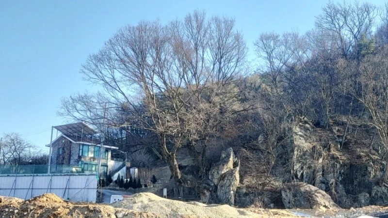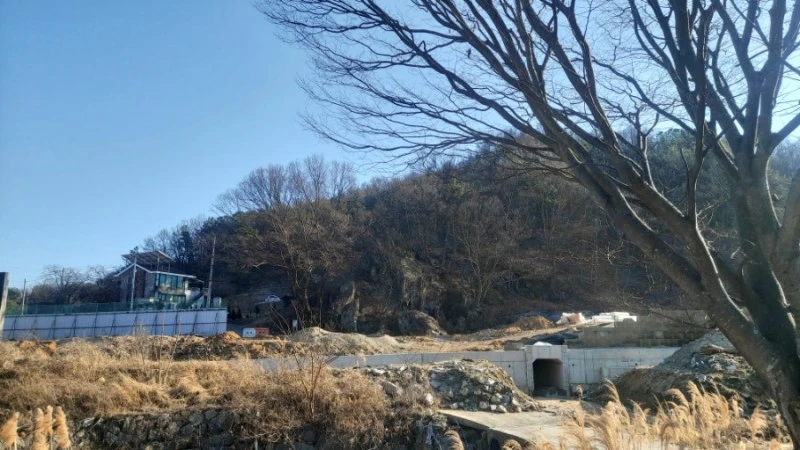 저수지 아래로 쭉 내려가 마을 입구 공단이 들어선 맞은편에 있는데, 현재는 바위 앞으로 도로공사중이어서 가까이 가볼 수는 없었어요. 개울 너머 멀리서 바라만 봐야 해 조금 아쉬웠답니다.