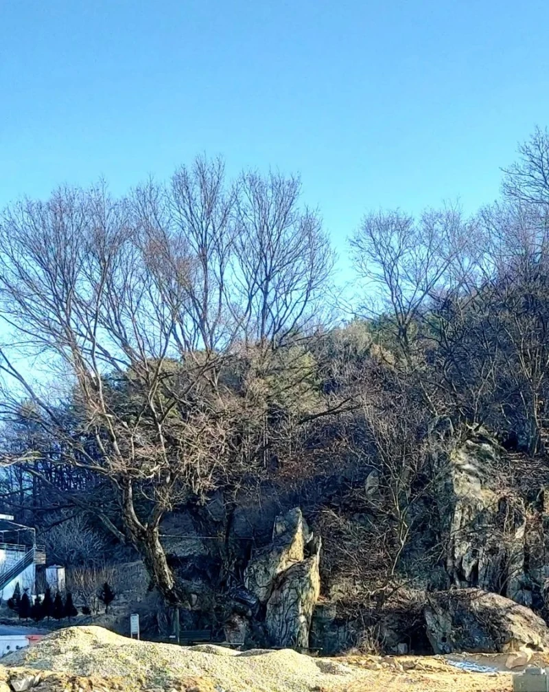 바위 앞의 커다란 나무가 보호수라는 표지판이 멀리서도 보이는데 정확한 수령은 모르겠어요. 공사가 어서 끝나서 선바위와 그 바위를 뚫고 나온 듯한 모양새의 나무를 가까이에서 보고 싶습니다.