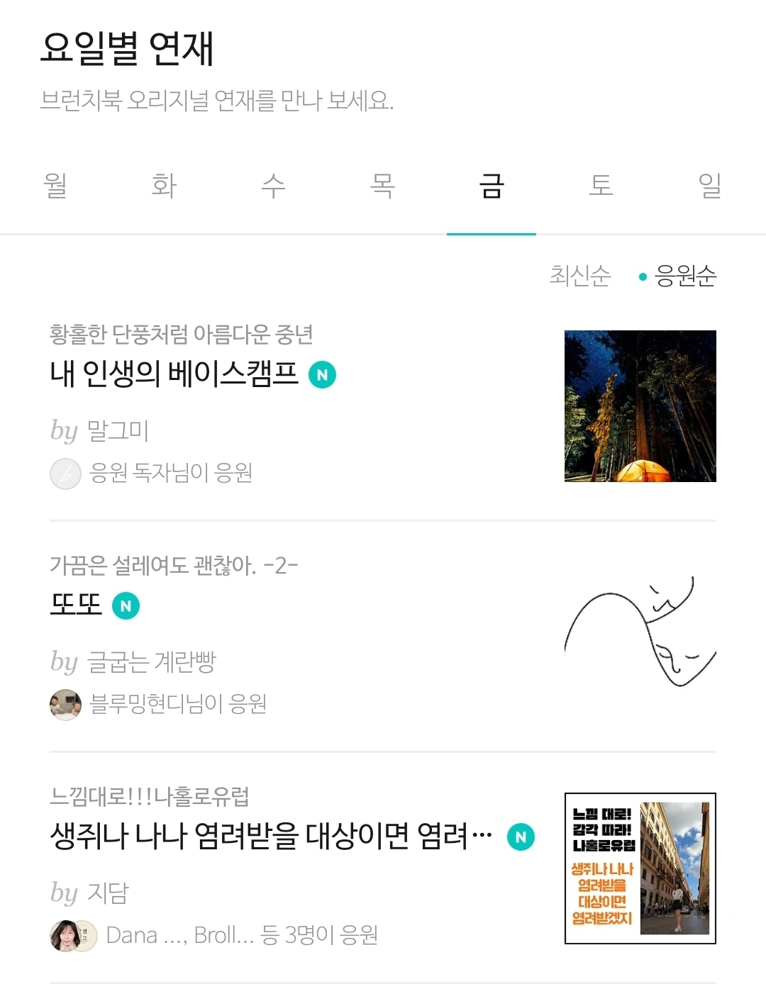 어제 올린 "내 인생의 베이스캠프"도 글 올린 지 2시간 뒤인 9시 무렵 금요 연재물 인기도(응원순) 1위에 이름을 올리고는 하루종일 1위 자리를 지키더라고요. 어젯밤 10시쯤 마지막으로 확인할 때까지도^^