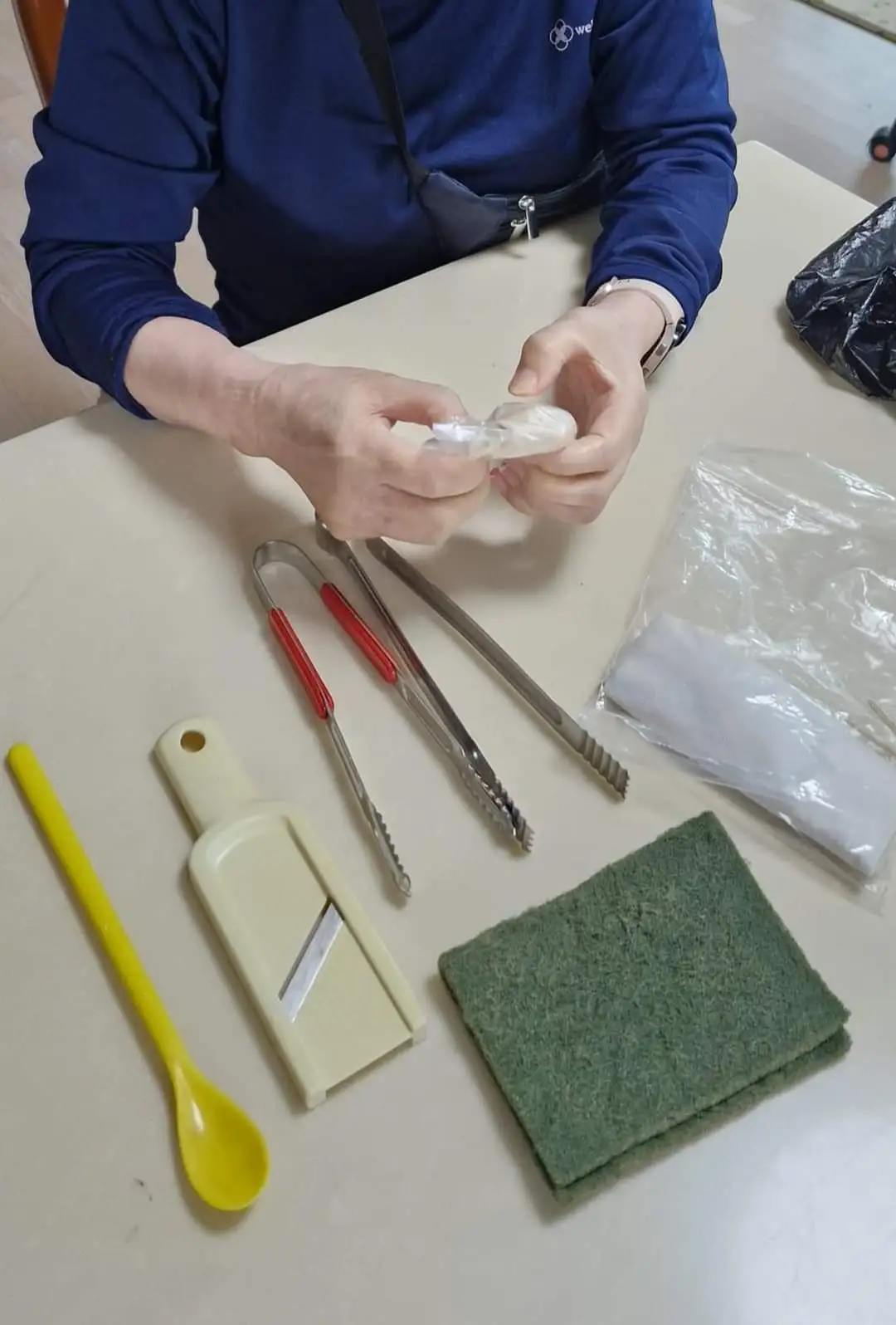 채칼, 감자칼, 과도, 국자, 뒤집개, 수세미, 숟가락,국물낼 때 쓰는 면보랑 주머니가 종류별로 쫘르르~