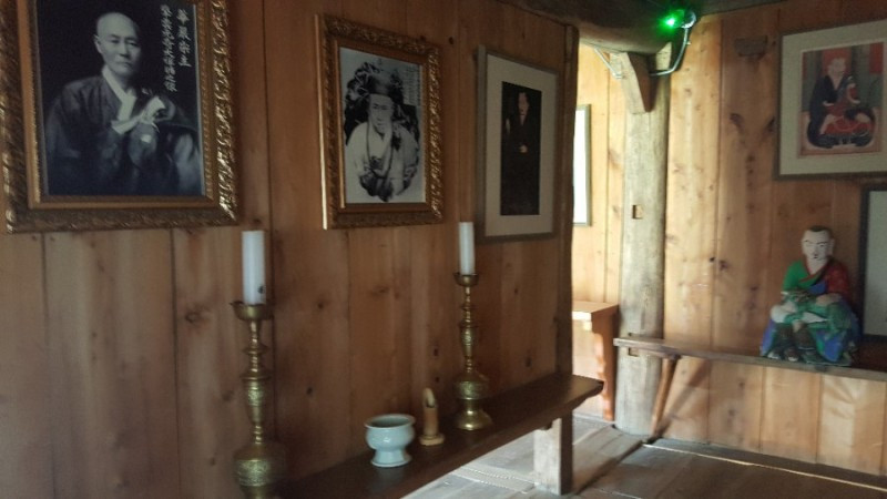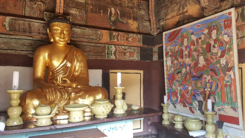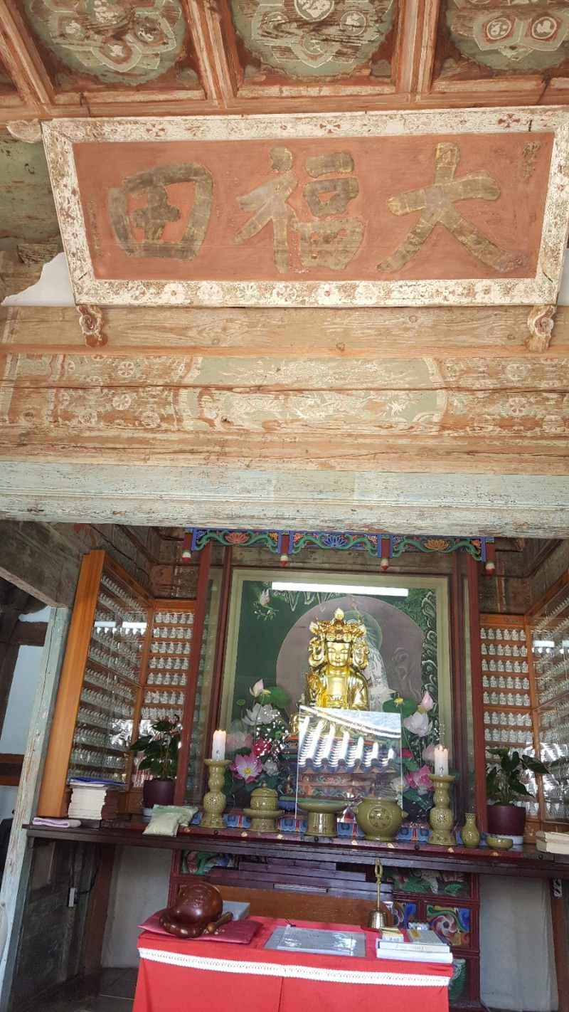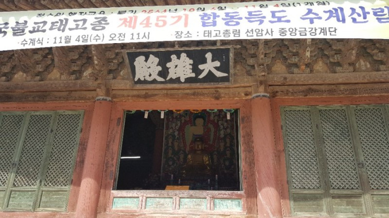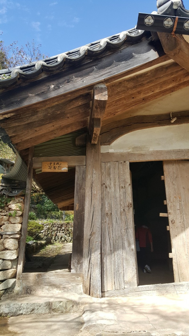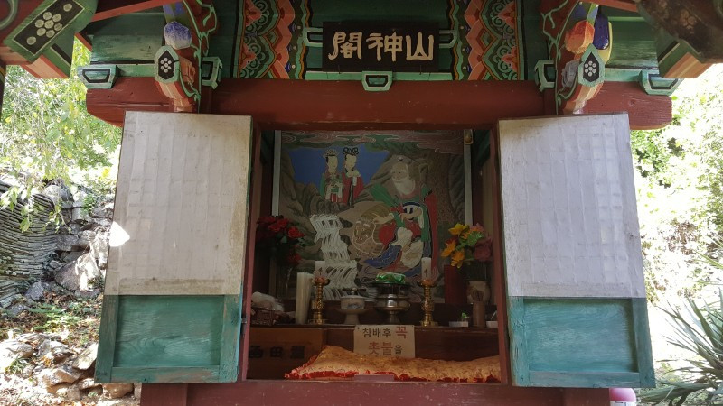 대웅전 영역을 둘러보는 동안 수업이 끝나서 만세루 안에 들어가 선암사 전 방장이셨던 혜초대종사의 사리 71과를 친견했다. (10.13.이 49재라 그때까지만 전시된다고 한다) 고색미 찬연한 선암사 전각들이 많지만 그 가운데 응진당 뒤에 숨은 듯이 자리한 작고 아담한 산신각이 인상적이었다. 혹시 산신각을 모르고 지나칠까봐 친절한 안내문까지 있을만큼 이렇게 작은 산신각이 있나 싶을 정도였다. 참배를 하려면 고개를 숙이고 무릎을 꿇는 아주 겸허한 자세만을 허락하는 산신각이다.