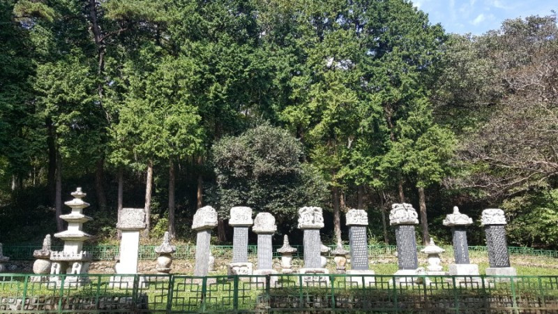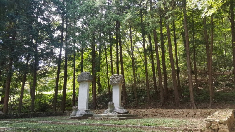 무우전과 각황전 뒤로 난 숲길을 조금 오르면 시원스레 뻗은 키큰 삼나무들 아래 네모반듯하게 정비된 잔디밭 중앙에 크고 멋진 비석 두 기를 볼 수 있다. 정유재란으로 불타버린 절을 약휴대사가 힘들게 복원한 내용이 기록된 중수비로 조각이나 표현기법이 아름답다.