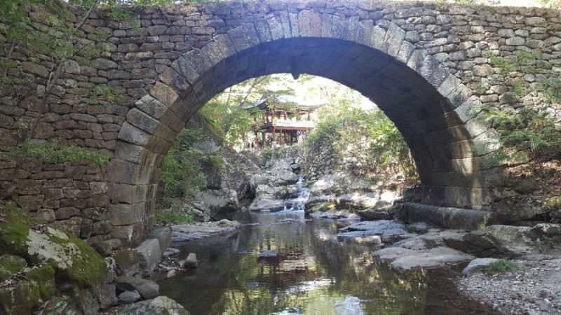 보물 400호로 지정된 승선교는 금강산 장안사 입구의 비홍교와 더불어 우리나라의 몇 안 되는 아름다운 무지개 돌다리다. 홍예뿐만 아니라 석축까지 시멘트보강 없이 자연석들을 쌓아 자연미를 살렸다고 한다.(홍예란 중국에서 무지개가 된다고 여겨졌던 용의 일종으로 무지개처럼 휘어 반원형의 꼴로 쌓은 구조물을 이른다)