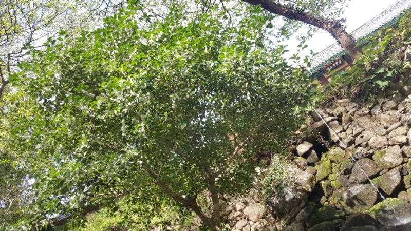 승선교와 강선루를 지나 타원형 연못 '삼인당'을 돌아서 일주문을 향해 가는 오르막길에서 문득 향긋한 꽃향기가 숲길 가득 번지며 마스크 속 콧구멍을 간질였다. 무슨 향이 이렇게 좋은 걸까? 주변을 찬찬히 둘러보니 조팝꽃처럼 조롱조롱 하얀 꽃을 단 꽃나무가 길가에 쭉 늘어섰고, 그 꽃에서 나는 향 같았다. 왠지 느낌상 은목서일 것 같다는 생각에 은목서로 검색해서 나뭇잎과 꽃모양을 비교해보니 바로 맞았다!
