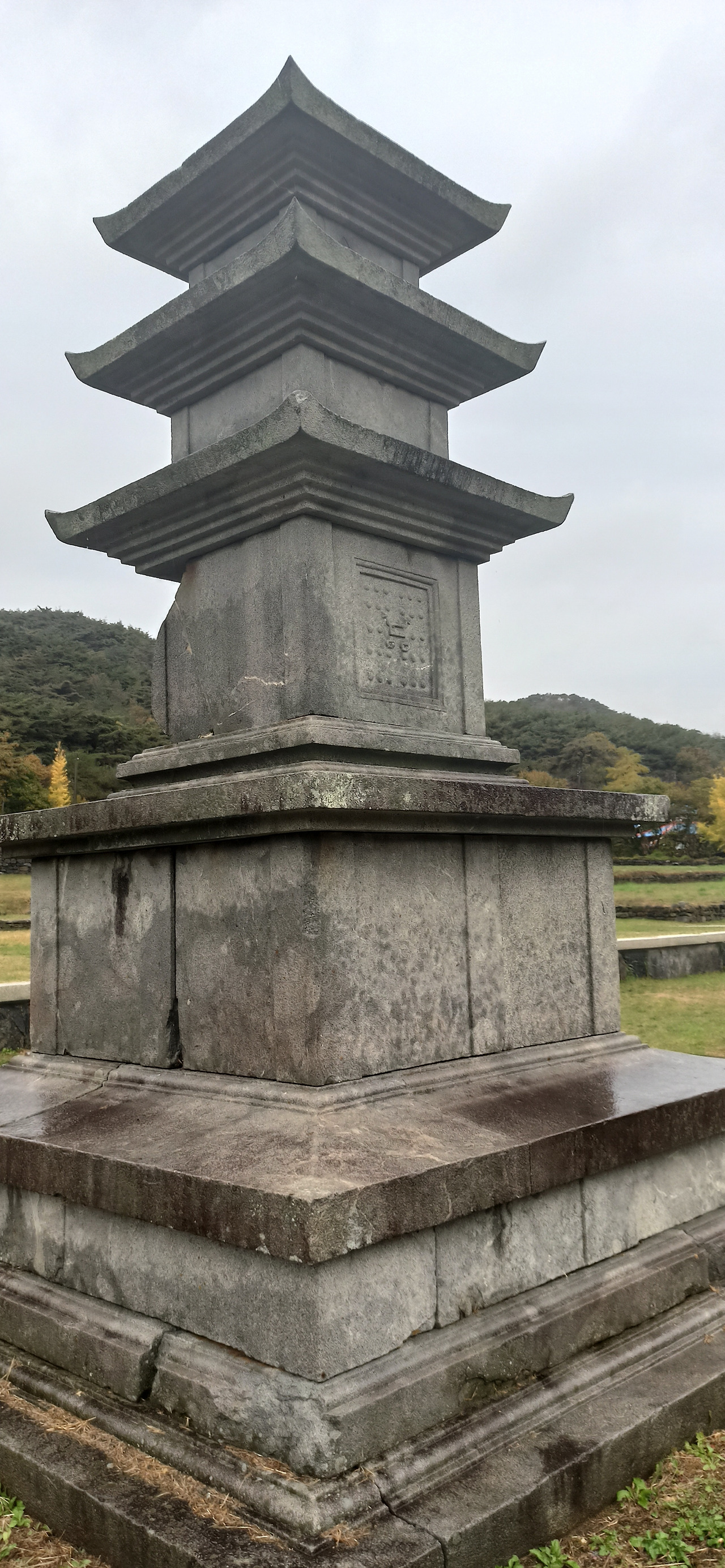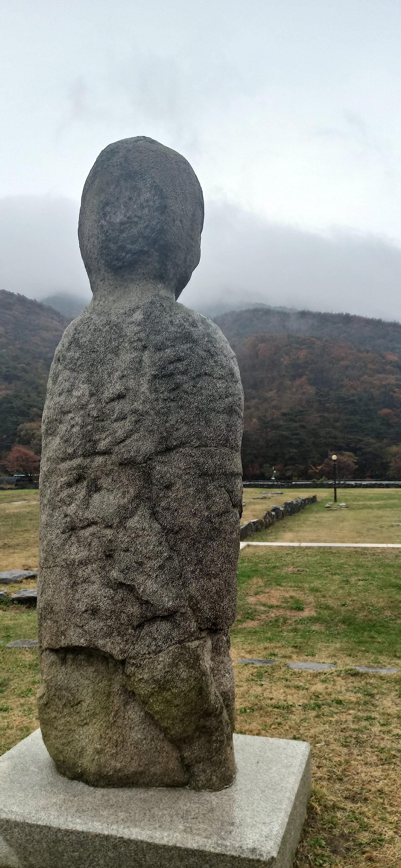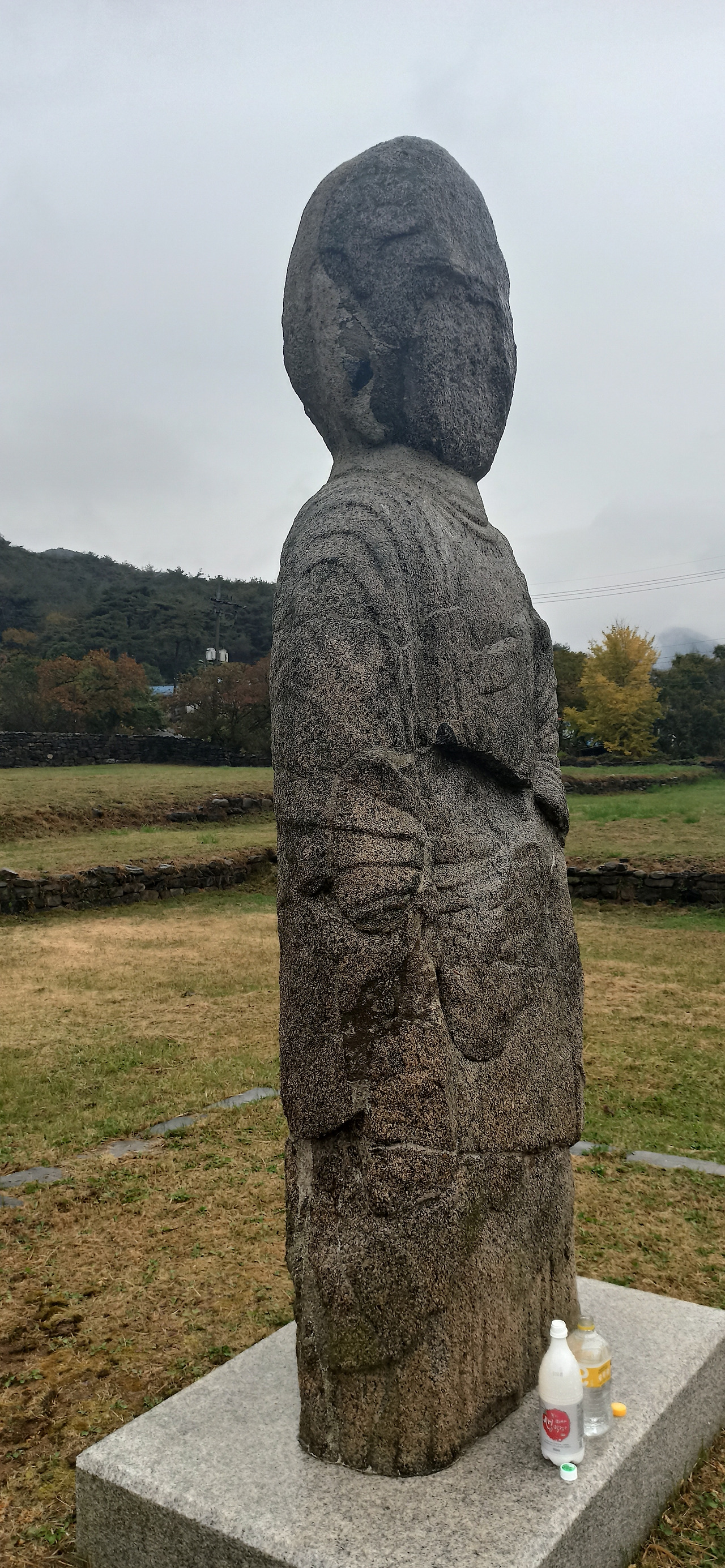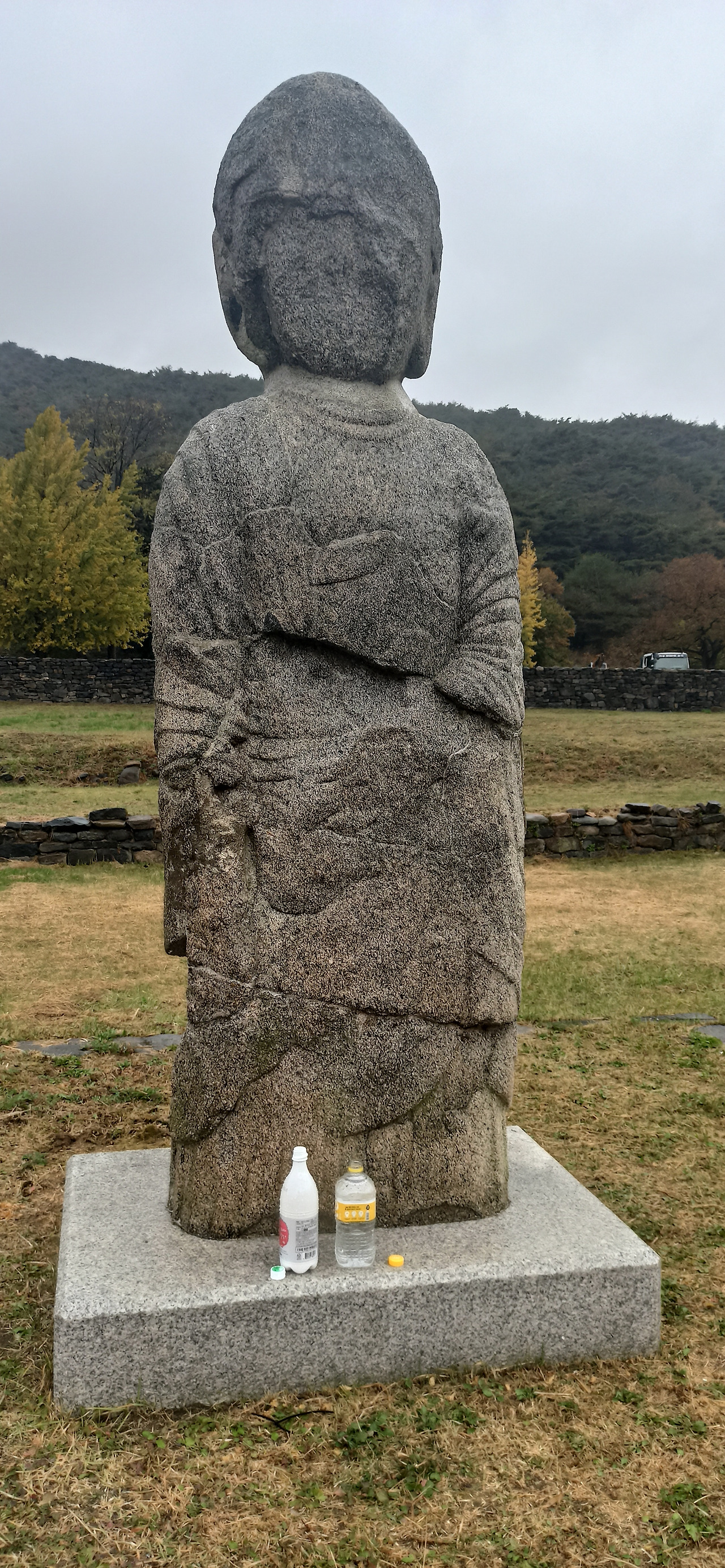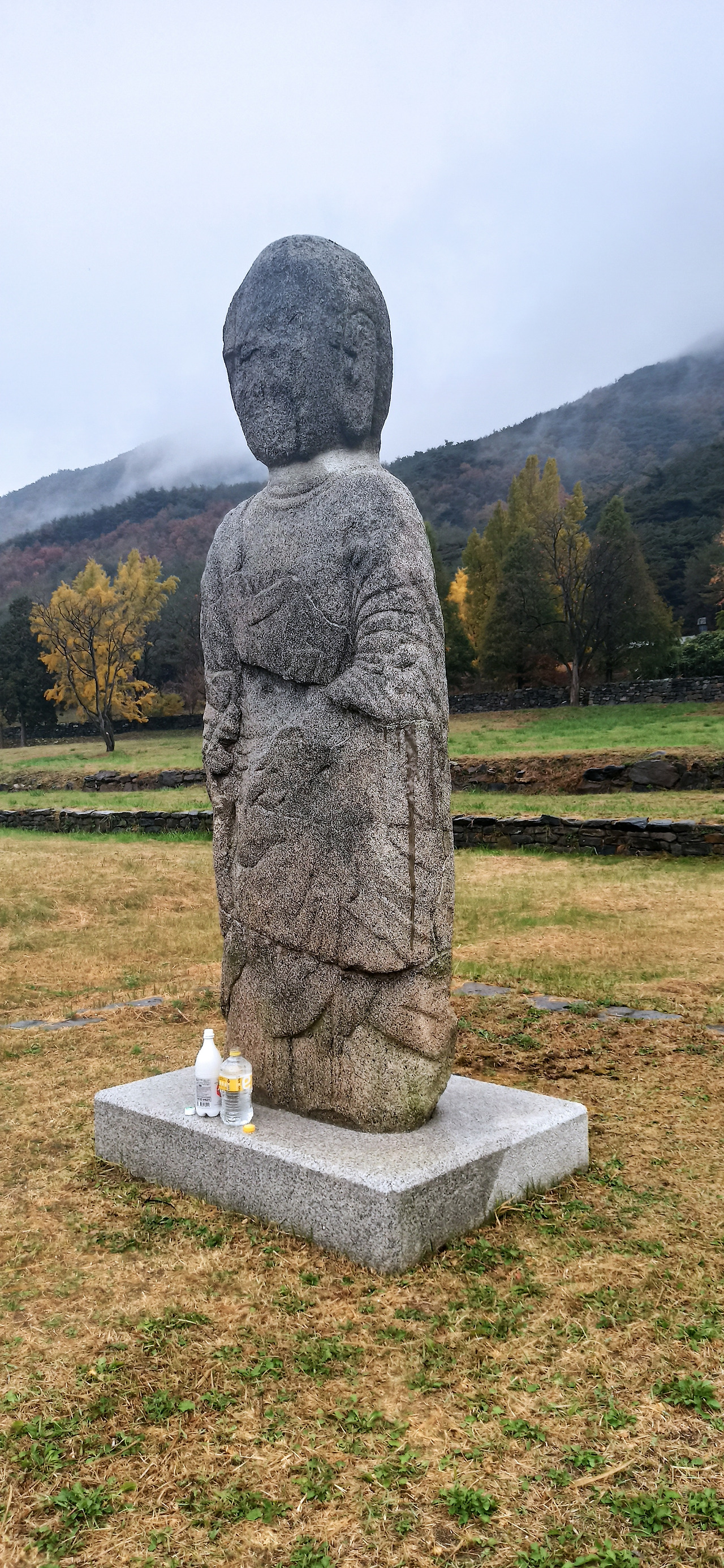 기단 부위가 깨지거나 상륜부가 없어지긴 했으나 더 오래전에 만들어졌음에도 비교적 보존상태가 좋은 석탑들에 비해 석불은 심하게 풍화되어 얼굴은 거의 사라지고 코는 시멘트로 보수했다는데 다 갈아낸 듯한 모습인 데다(오히려 뒷머리가 더 선명한 편. 일본 귀신 가오나시를 닮았다) 오른쪽 귀도 없어지고, 두 손도 다 사라지고 없건만 의외로 법의의 옷주름은 U자형으로 선명하게 남아있어 보는 마음이 짠했다. 그래도 막걸리랑 생수를 바치며 발원을 드릴 만큼 성주사지에 있는 석조물 가운데 가장 사랑받는 문화재인 듯 하다.