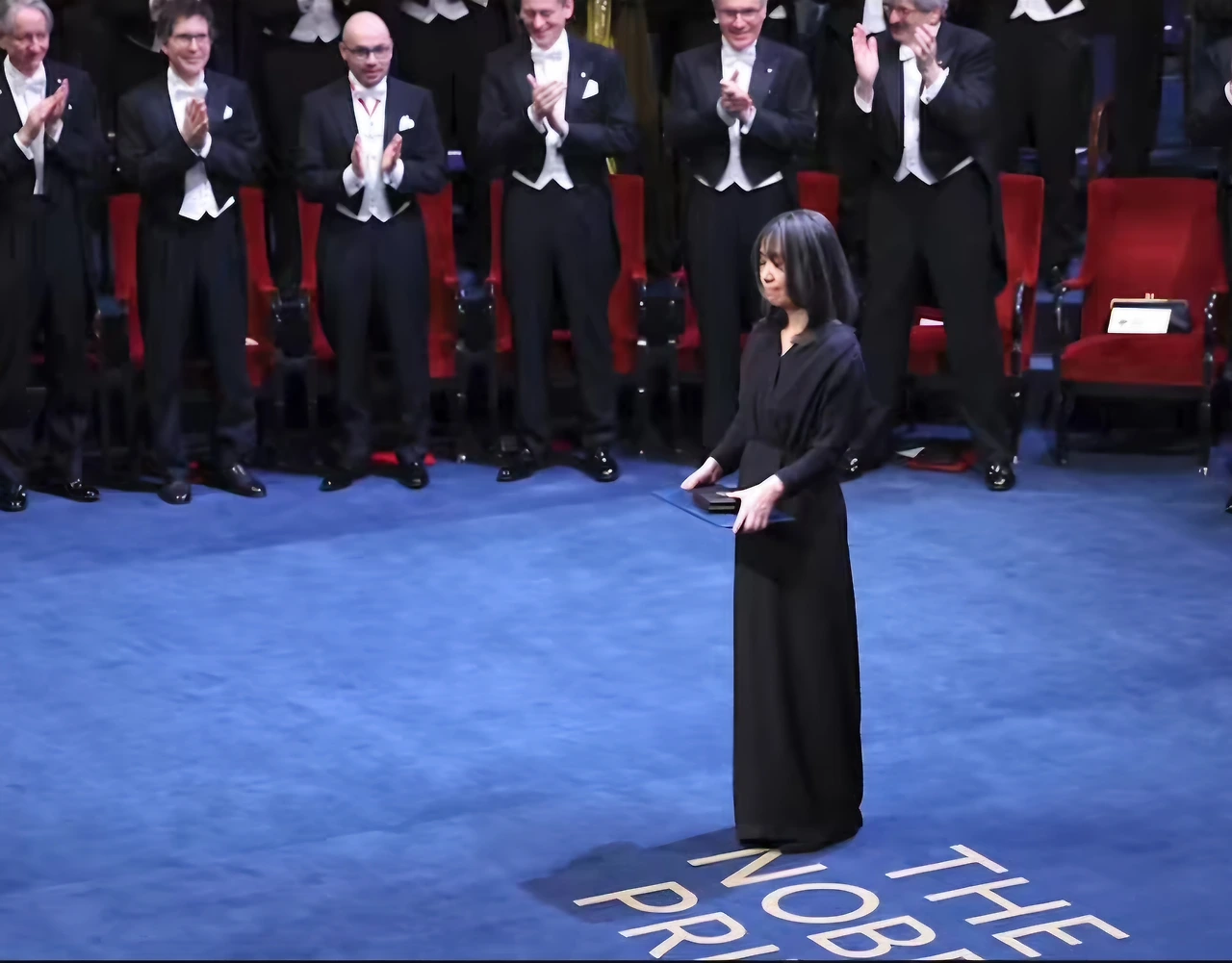 한강이 자리에서 일어나 무대 가운데로 향하자 장내 참석자들이 모두 기립했고, 그가 메달과 증서를 받아 들고 환한 미소를 띠며 국왕과 악수하자 박수가 쏟아졌습니다.