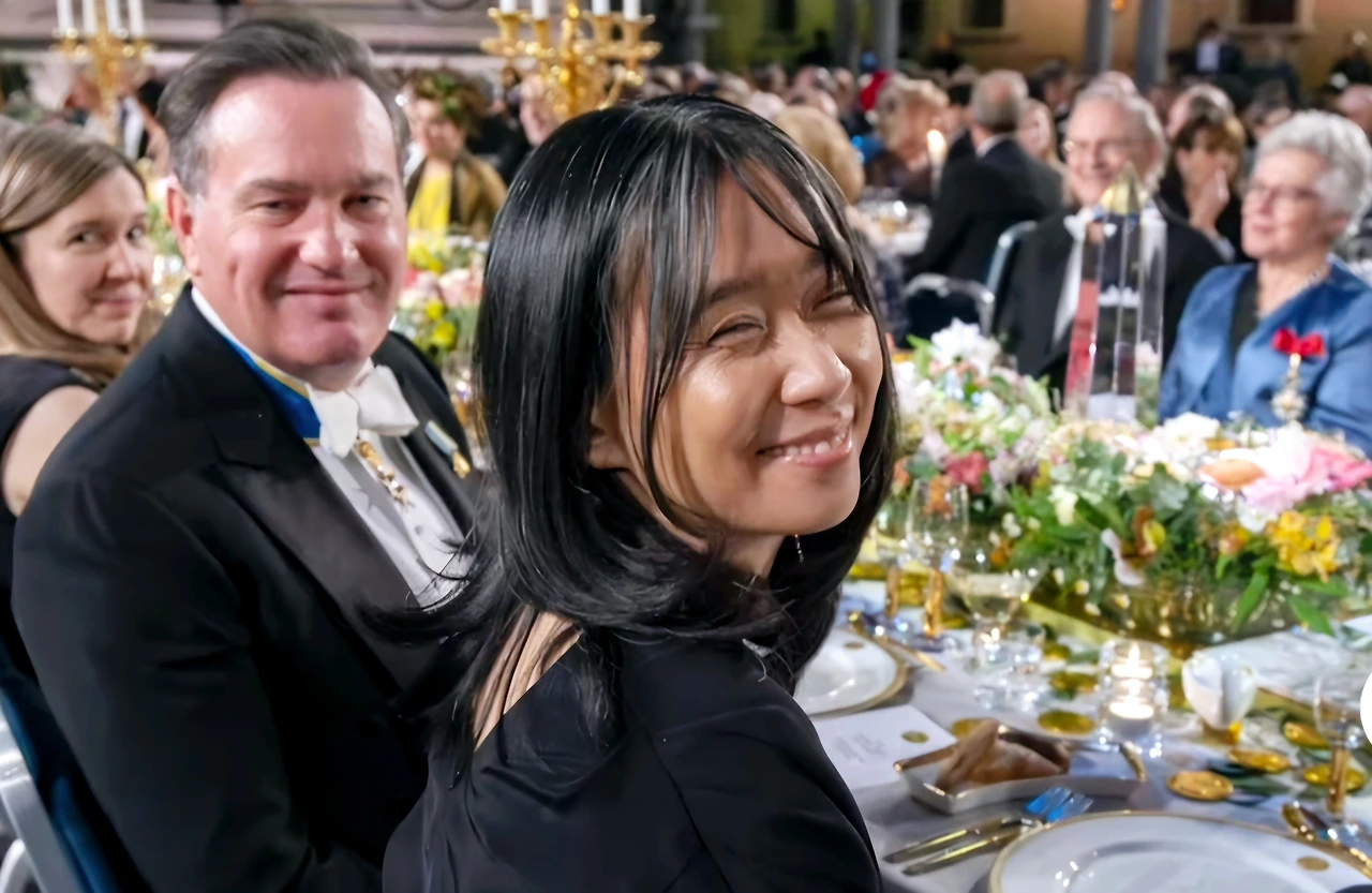 스톡홀름에 가족을 동반하지 않고 참석한 것으로 알려진 한강은 스웨덴 국왕의 사위인 크리스토퍼 오닐과 함께 연회장에 입장했고, 국왕과 대각선으로 마주 보는 자리에서 연회를 즐겼습니다. 수상자는 연회에 지인을 초청할 수 있어 한국 출판사 관계자들도 함께 자리했습니다.