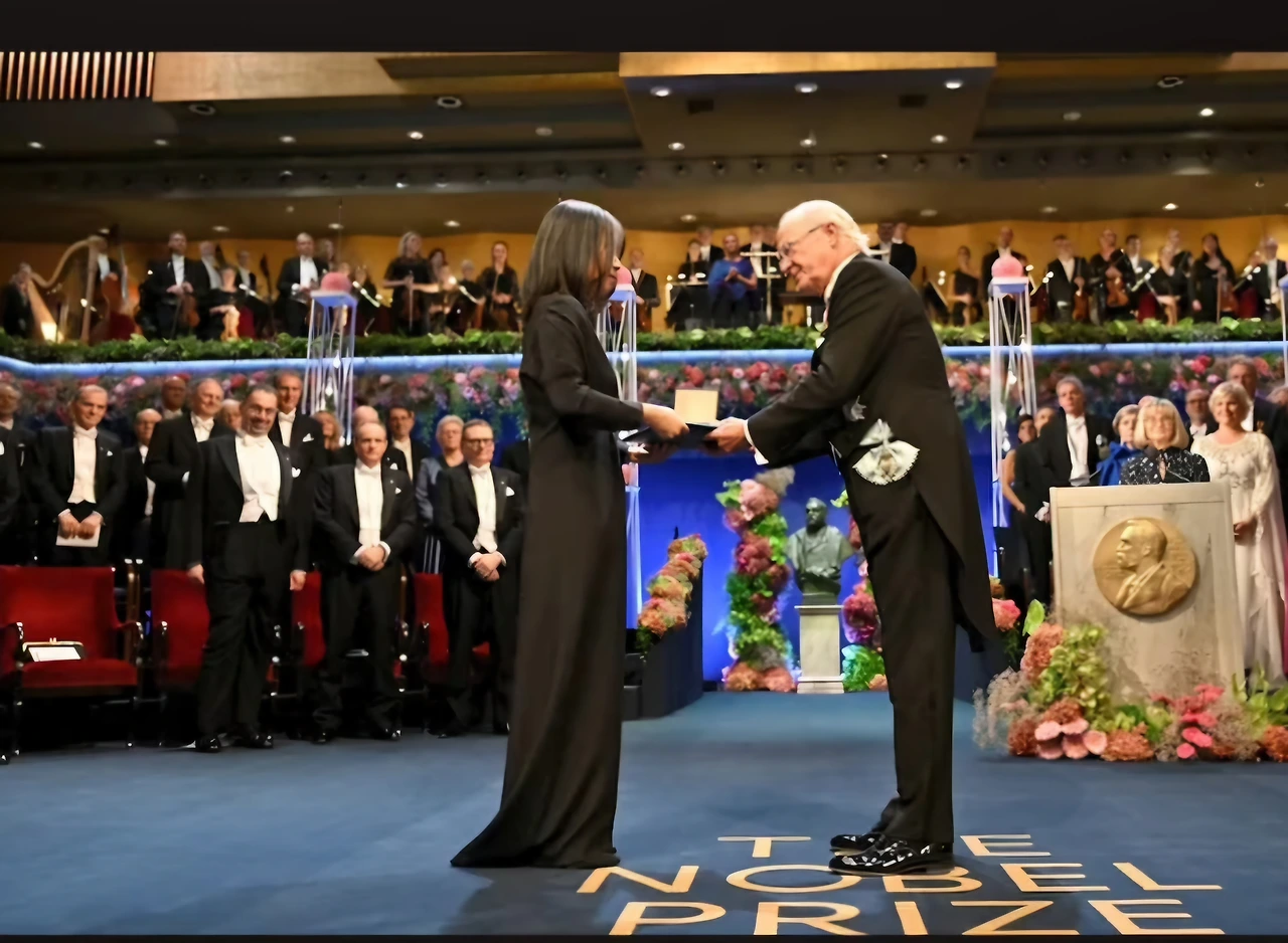 한강은 12월 10일 오후 스웨덴 스톡홀름의 랜드마크인 콘서트홀에서 열린 '2024 노벨상 시상식'에 참석해 칼 구스타프 16세 스웨덴 국왕으로부터 노벨상 메달과 증서를 받았어요.