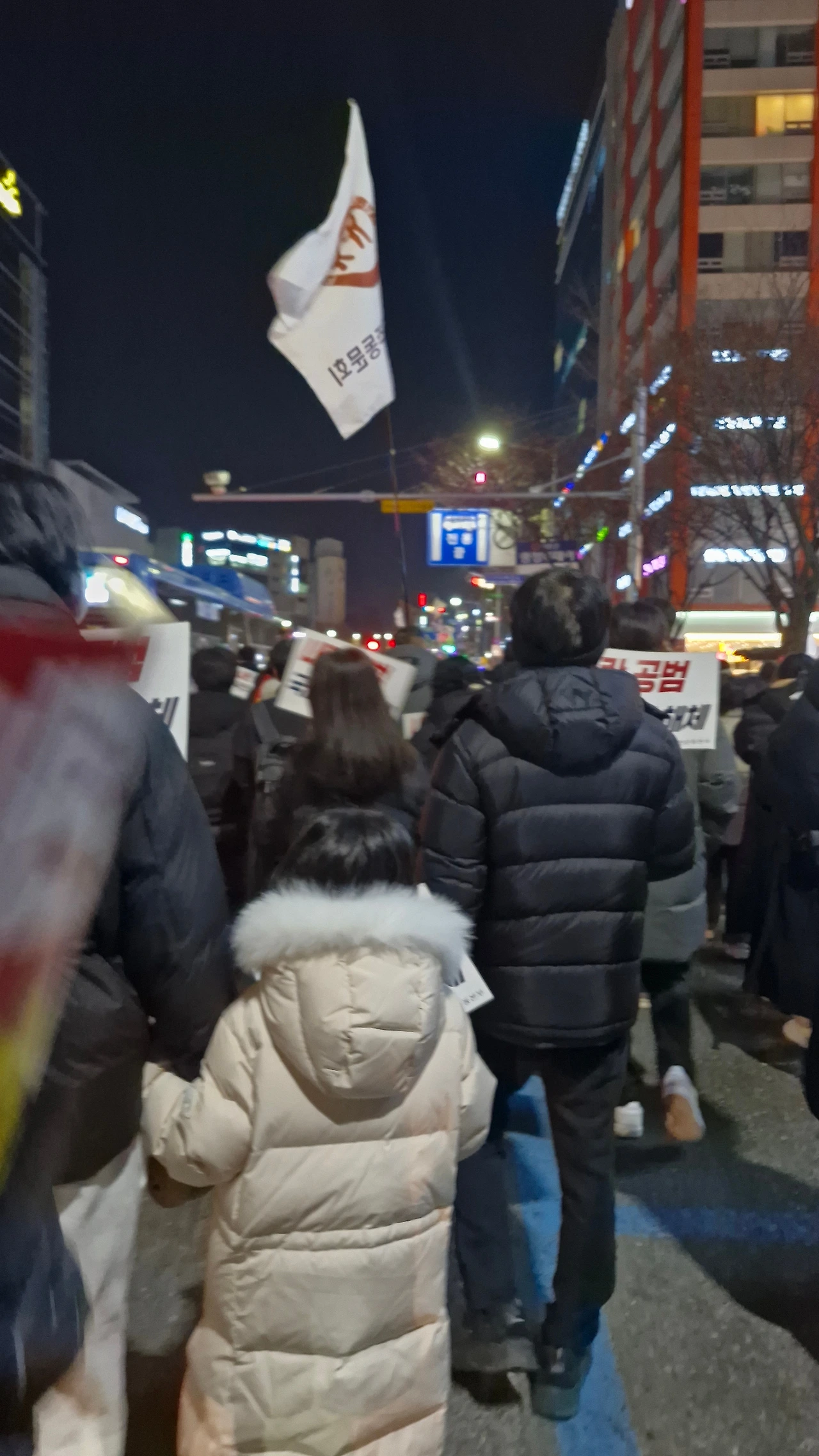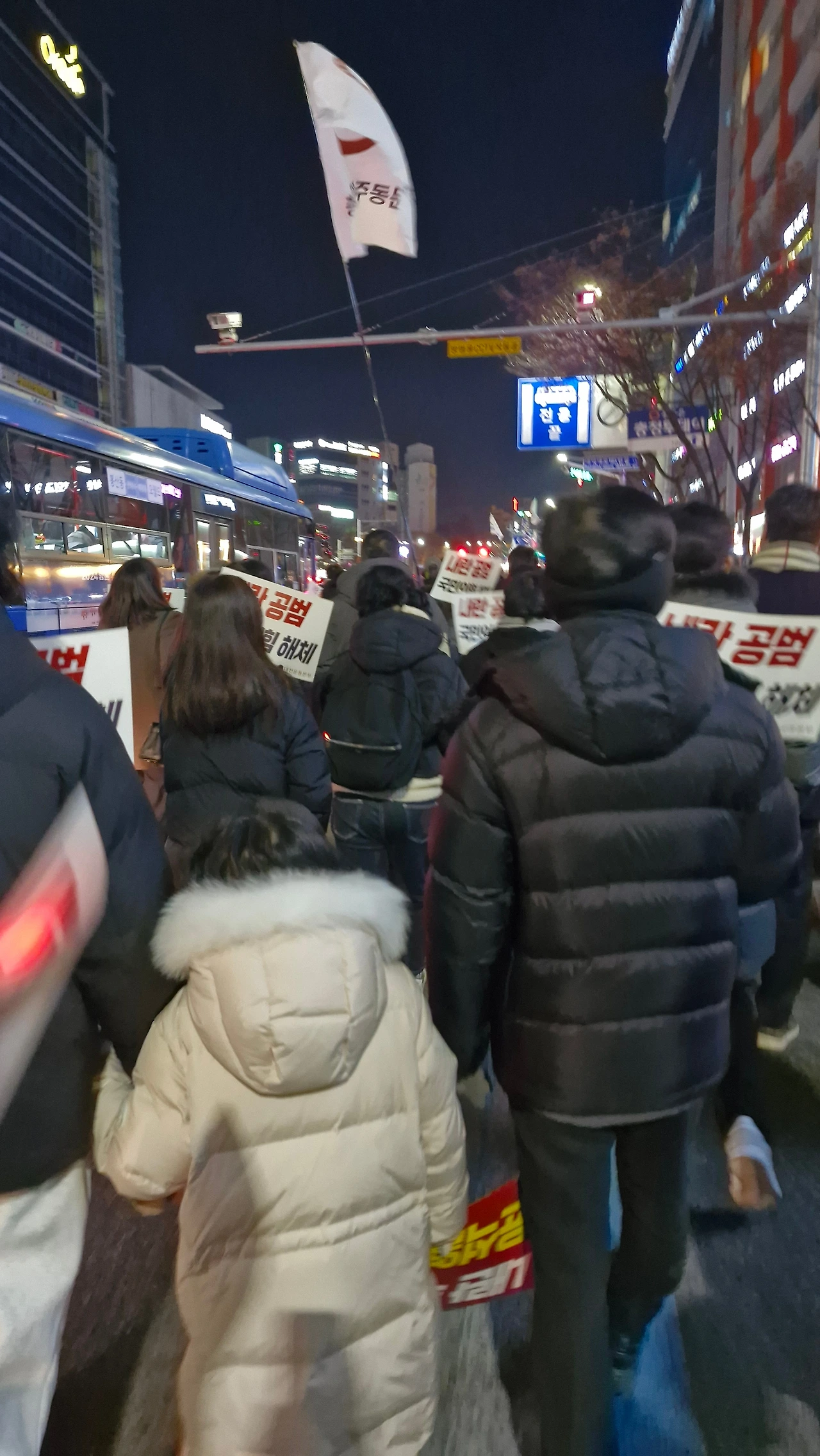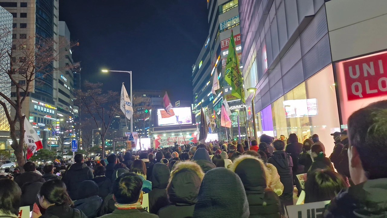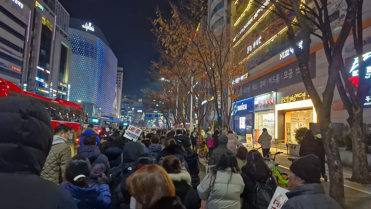 "내란범 윤석열을 탄핵하라! 내란공범 국민의 힘을 해체하라!"를 시민들과 함께 외치며 은하수네거리에서 시작해 이마트사거리를 거쳐 경성큰마을사거리까지 행진했다가 갤러리아 맞은편 은하수네거리에서 9시에 마무리를 했답니다.
