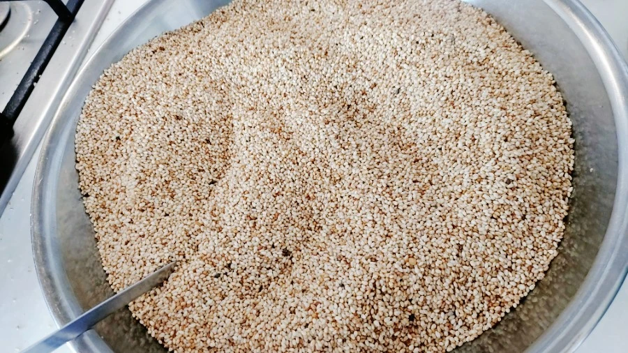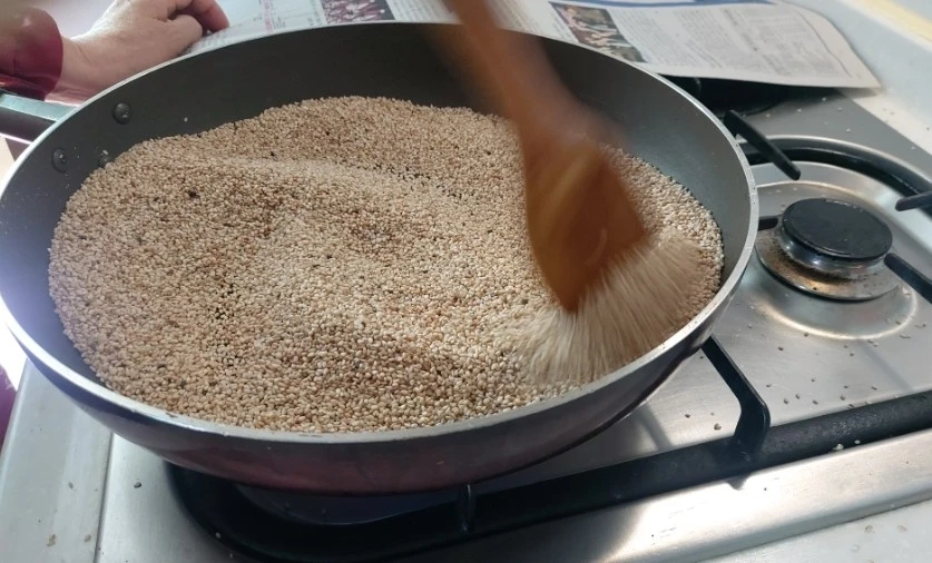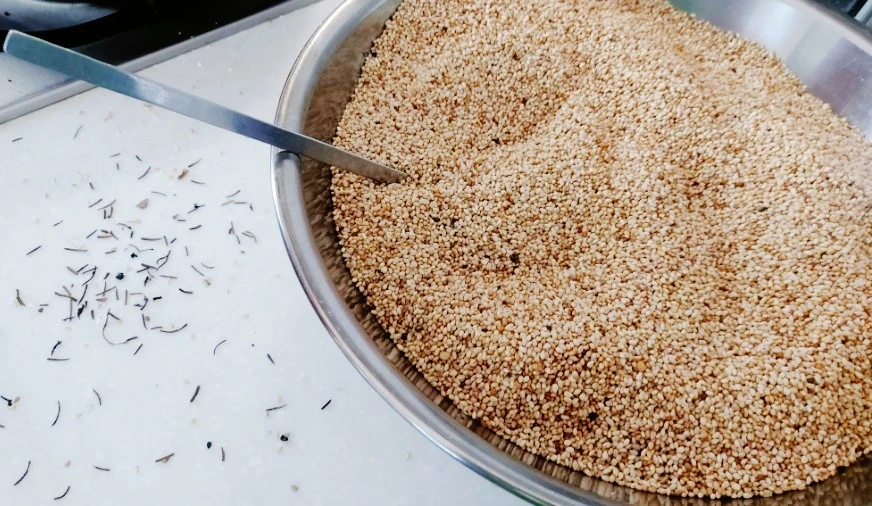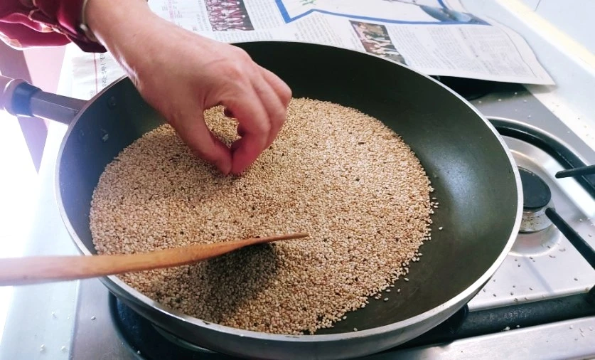 후라이팬에 넣고 볶으시다가, 불순물이 보이면 그때그때 바로 집어내신다. 밭에서 참깨대를 베어서 말린 뒤 털어서 담는 과정에 이물질이 개입하기 마련이기 때문이다. 그래서 이렇게 깨를 볶는 과정에서 씻을 때 한 번 건져내고, 볶을 때 손으로 일일이 건져내고, 나중에 깨를 다 볶은 다음에 또 건져내야 한다. 깨에 이물질이 들어가면 안 되니까.