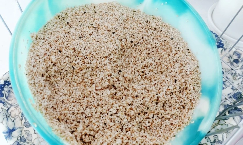 깨는 물에 담궈서 떠오르는 잡티를 제거하고 잘 씻은 뒤 채반에 건져낸다.