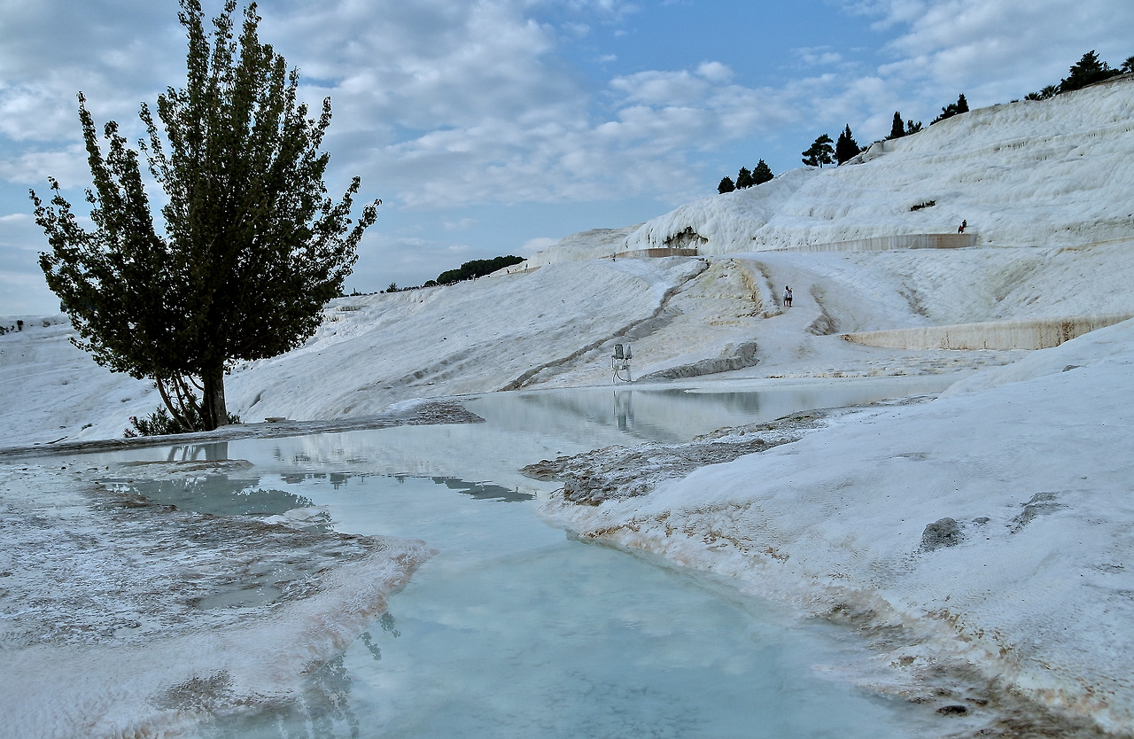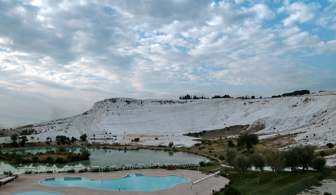 비키니를 입은 아가씨들은 서늘한 날씨에도 온천탕에 몸을 던지고, 마치 눈이 쌓인 것 같은 둔덕들을 배경으로 처음 만난 한국말이 유창한 이슬람 여인과 사진도 찍는 등 너무 재미있게 올라갔다. 올라가는 동안 저녁 햇살에 반짝이는 석회층과 아래의 에메랄드 빛 호수물은 환상적인 분위기를 연출하고, 냇물처럼 흐르는 온천물에 발을 담그고 족욕을 하며 짧은 언어로 대화하고 있는 관광객의 모습은 인종과 국가를 초월해 너무 다정해 보였다.