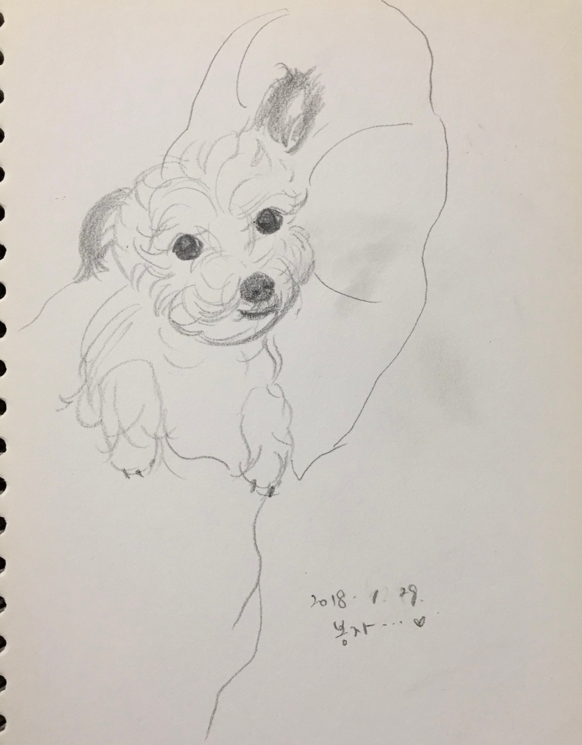 닮은 것이라곤 까만 콩인지 모를 눈 코뿐. 해피같이 반짝이고 윤이 나는 금빛 은빛 털은 한 터럭도 찾아볼 수가 없었고 대신 뻣뻣하고 부스스한 새까만 털들만 가득했다. 철없던 동생은 귀엽다며 마냥 좋아했지만 내겐 해피만 한 강아지는 없는 것이었다. 하지만 엄마 품을 떠나 꼬리를 축 늘어뜨린 채 슬금슬금 눈치를 보다 잠들어버린 강아지를 보며, 내 사랑을 주지 못해 미안하고 불쌍한 마음이 들기 시작했다. 부디 이 강아지를 사랑할 수 있게 해달라고 밤마다 기도했고, 결과적으로 그 기도는 너무나 잘 이루어져 그로부터 15년간 내 소중한 막내 동생으로 지내게 되었다.