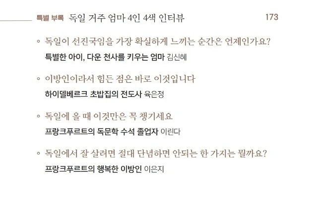 독일 거주 5년 차, 10년 이상 독일에 사신 선배 엄마들과의 인터뷰글도 별사탕처럼 특별부록으로 실렸어요. 제 글과 합해서 5인 5색의 스토리를 만나실 수 있습니다.