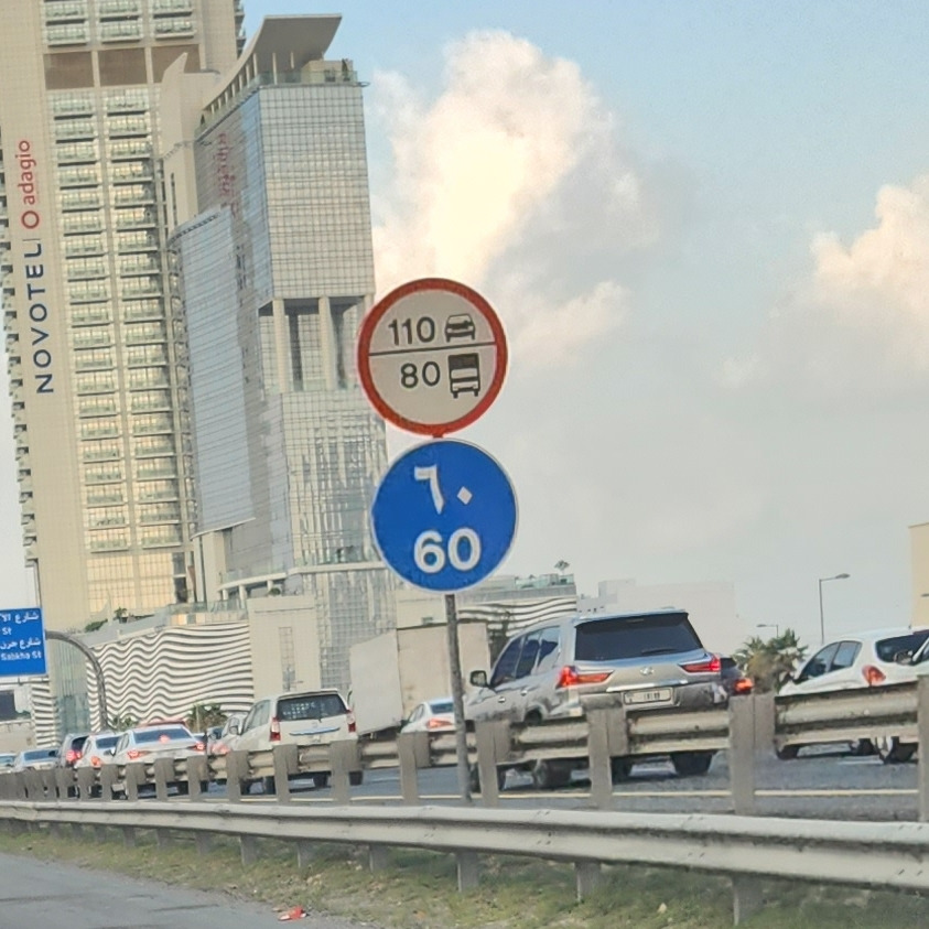 1. 최대 속도는 표지판의 + 20km/h까지 아부다비를 제외한 모든 UAE에서는 속도제한 표지판보다 초과 시속 20km까지는 허용된다. 110이라고 쓰여있다고 시속 110km로 달리면 시속 130km의 차량들이 상향등키고 달려오니 조심.