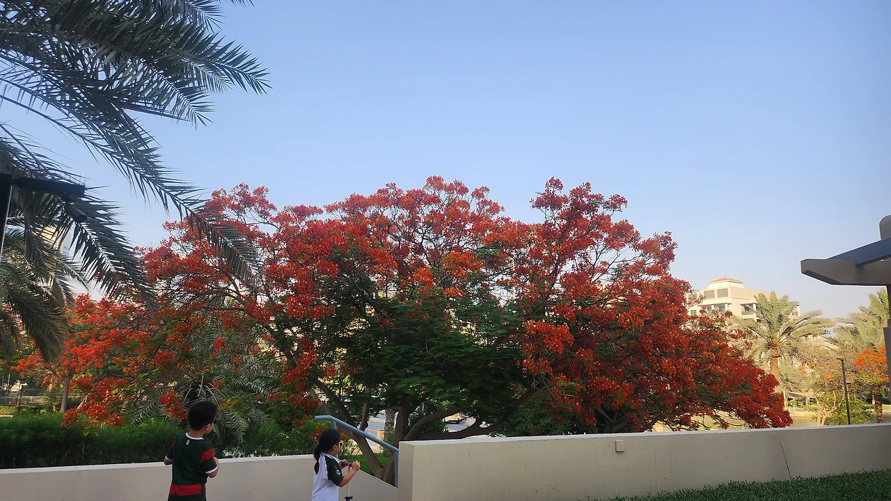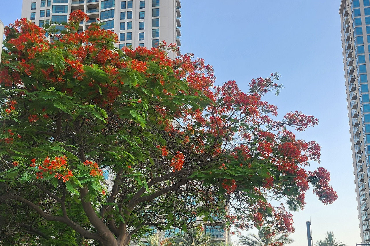 우리는 이렇게 답답한 5월이지만, 다홍빛 꽃들이 만개한 봉황나무가 마치 여의도 윤중로 벚꽃나무처럼 두바이 곳곳에서 자태를 뽐낸다. 세계에서 가장 아름다운 나무라던데, 감상할 여유보다는 뜨거운 더위가 내겐 더 크게 다가온다. 이것이 바로 두바이의 5월 더위다.