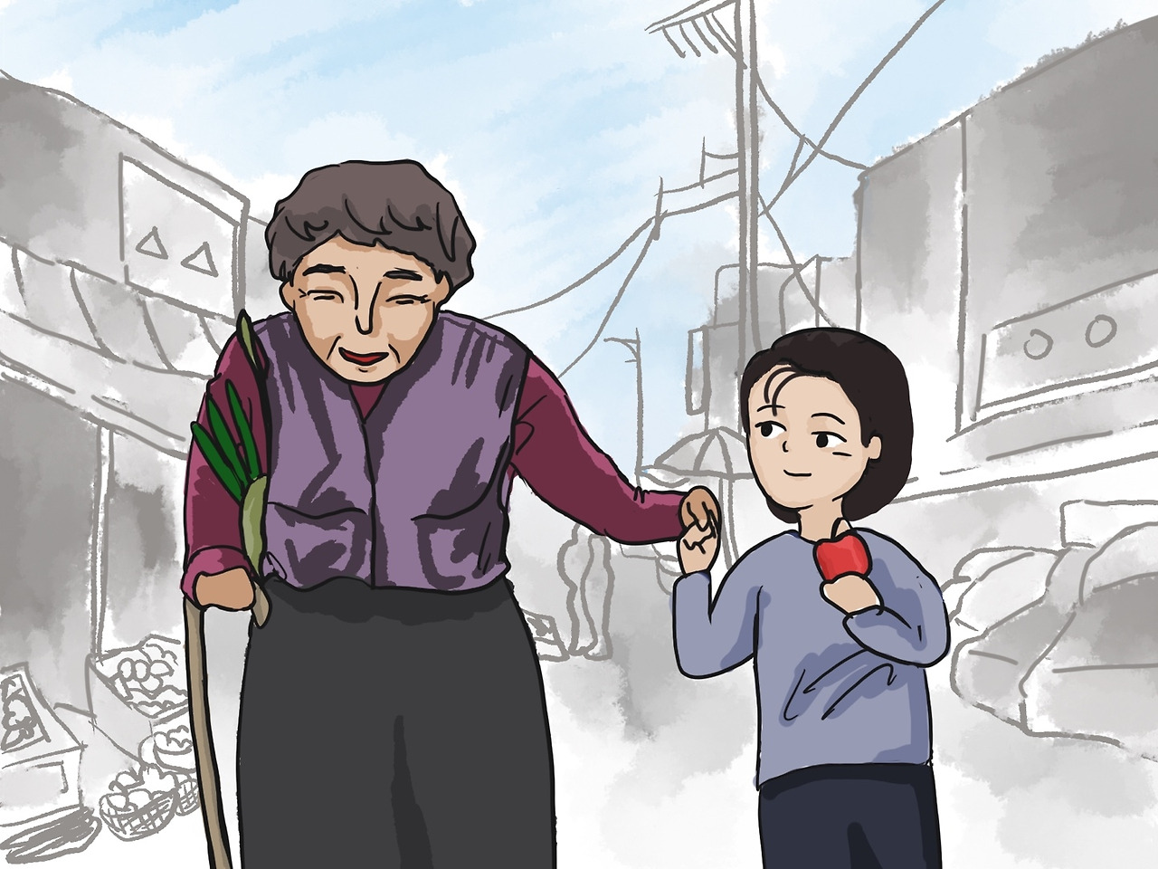 제수는 멋쩍은 미소를 지으며 말없이 할미손을 꼬옥 잡았다.