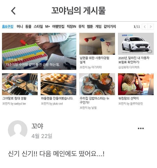 그리고 며칠 후 다음 메인에 그녀의 브런치 글이 올랐다. 말 한번 나눠보지 못한 얼굴조차 모르는 타인의 기쁨이 온전히 나의 행복이 되는 경험을 했다.