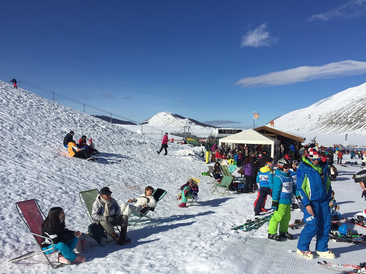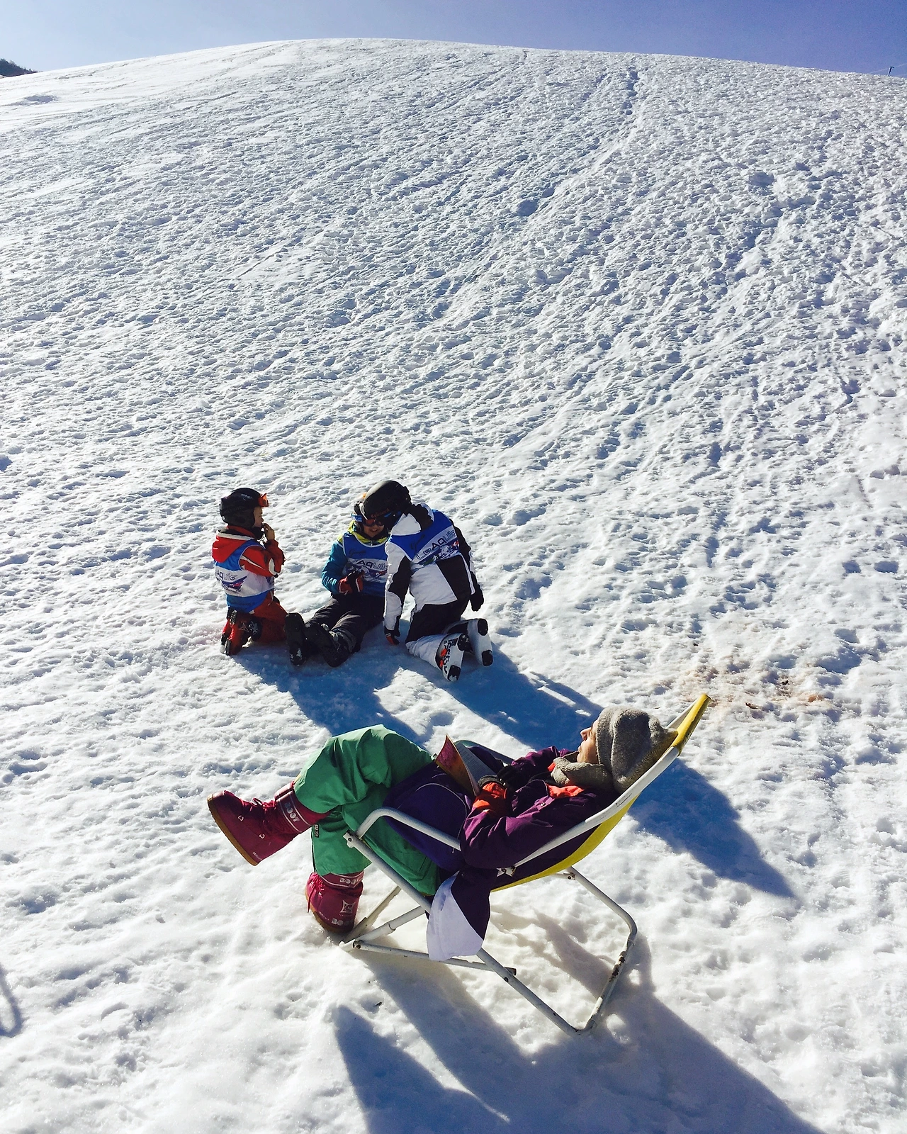 특히나 곳곳에서 이루어지는 아이들의 스키수업 모습은 무척 유쾌했다. 날이 더 좋아진다. 장갑 없이 스키를 타도 무리가 없는 날씨다. 한쪽엔 태양을 향해 앉은 무리가 형성됐다. 여름의 해변과 크게 다르지 않은 풍경이다.