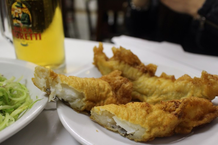이 바칼라 튀김 가게는 이탈리아가 유로가 아닌 리라를 쓰던 오래전부터 이 자리를 지키고 있는 곳이다. 산타 바바라 성당이 있는 작고 예쁜 광장 한 모퉁이에 자리하고 있다. 이 날은 축구경기가 있었는데 정말 아주 오래된 단골의 포스가 가득한 할아버지 5분이 맥주 한잔에 튀김 한 접시를 시켜놓고 진지하게 축구를 시청 중이었다. 뭔가 낯익은 아버지 단골 전집 같은 분위기가 풍긴다.