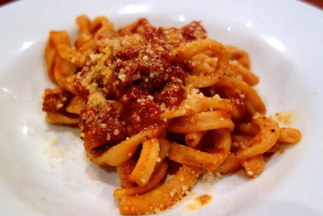 우리가 보통 미트 소스라고 부르는 라구 소스는 야채와 토마토, 고기 간 것을 오랜 시간 끓여서 만든 소스를 총칭하는 말입니다. 지역마다 들어가는 재료나 조리방법이 조금씩 다른데, 가장 유명한 것은 뭐니 뭐니 해도 볼로냐식입니다. 오죽하면 라구 소스의 파스타를 지칭하는 명칭을 파스타 볼로네제라고 할까요. 쇠고기와 돼지고기 간 것, 당근, 양파, 셀러리 다진 것을 볶은 후, 적포도주와 토마토를 넣고 낮은 불에서 오랜 시간 끓여서 만듭니다. 오래 끓여야 제대로 된 라구를 맛볼 수 있기 때문에 먹기 전에 뚝딱 만들 수 있는 요리가 아닌, 우리의 곰탕처럼 정성으로 끓이고 끓여서 우러나는 맛이라 할 수 있습니다.