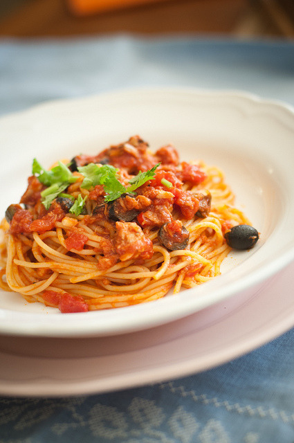 스파게티 알라 푸타네스카(Spaghetti alla Puttanesca)는 그 이름만으로도 한몫을 합니다. 푸타네스카는 '매춘부'라는 뜻을 가집니다. 이런 별스런 이름으로 불리게 된 것은 푸타네스카 소스가 여러 가지 다양한 맛의 재료를 섞어서 만든 잡탕 소스이기 때문이기도 하죠. 그것도 강한 맛을 지닌 앤초비, 올리브, 케이퍼, 토마토 같은 재료를 이용해 만들기 때문에 맛이 강렬해 생겨난 이름입니다. 여기에 들어가는 올리브는 검은색이나 녹색을 올리브보다 작고 향기로운 붉은 포도주 색의 올리브가 들어갑니다. 몇 주간 흐르는 물에 푹 담가 두었다가 염수 처리를 거치면 올리브는 독특하고 부드러운 향기를 머금고 감미롭고 쓴맛이 나는 상태로 변합니다.