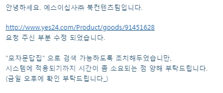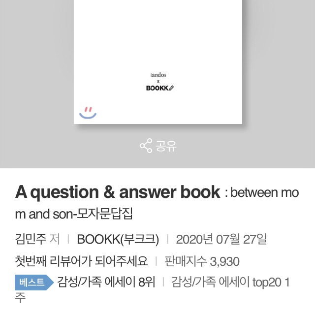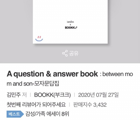책 제목이 영문에 길어서 한글로 검색이 가능하면 좋겠다는 의견을 받아들여 #모자문답집 으로 검색이 가능하도록 부크크와 예스24에 요청을 해서 수정했다. 가장 많은 판매가 이루어지는 예스24에는 #한국에세이 로 카테고리가 분류되어 있었는데 책 성격에 더 맞도록 #감동/가족에세이 로 카테고리를 수정했다.