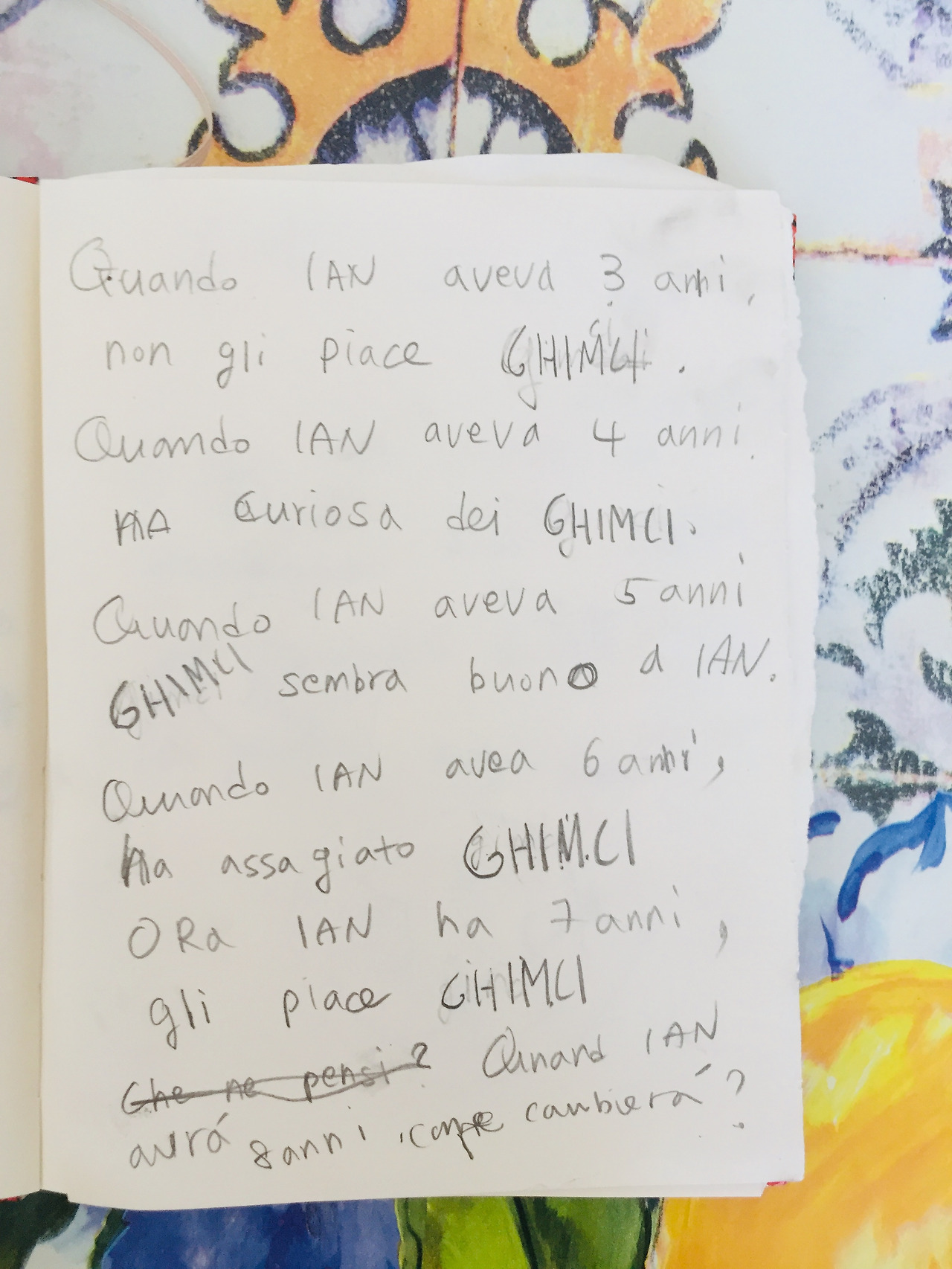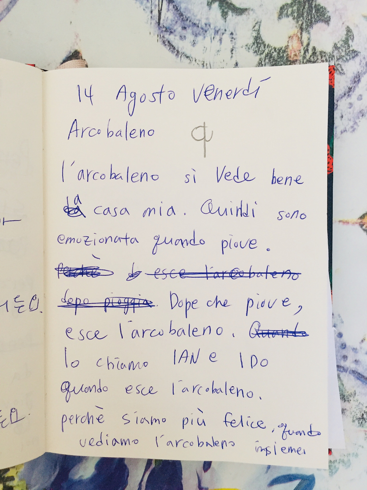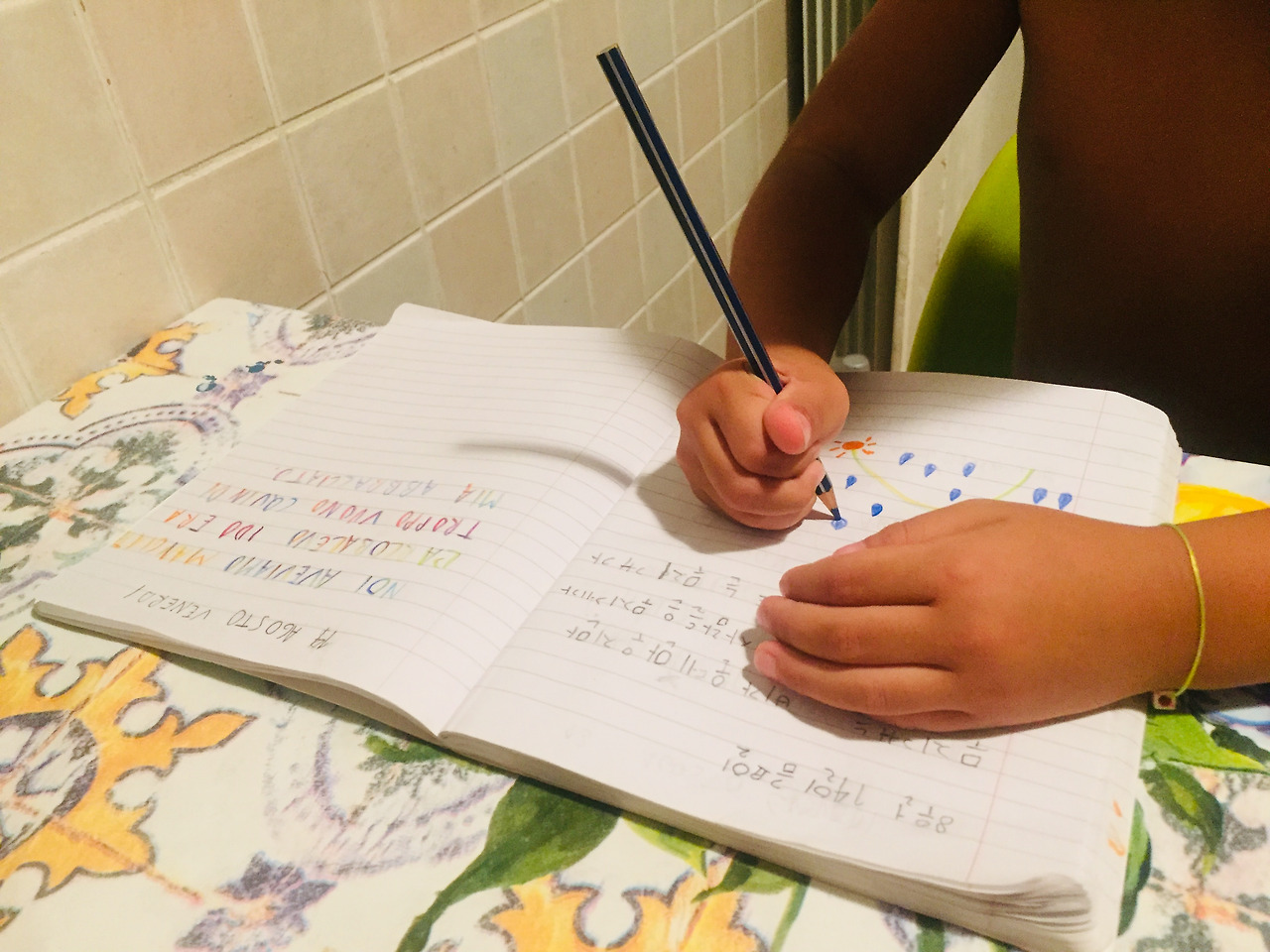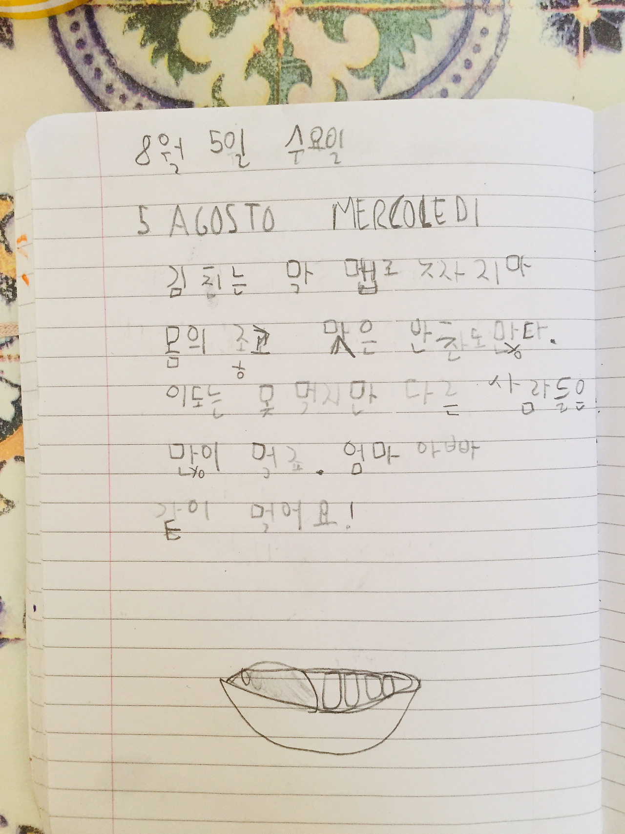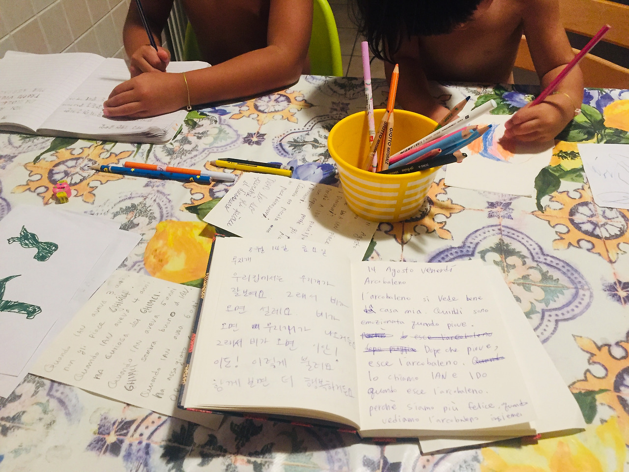 지금도 이탈리아 친구들도 만나고 거리에서 만나는 사람들과도 대화가 이루어지지만 이 이상의 어휘나 문장을 만날 기회가 학교를 다닐 때에 비할 수는 없다. 그래서 3월 휴교가 시작된 시점부터 아이와 매일 일기 쓰기를 시작했다. 한국말 이탈리아 말로 두 가지 언어로 쓰는 일기다.