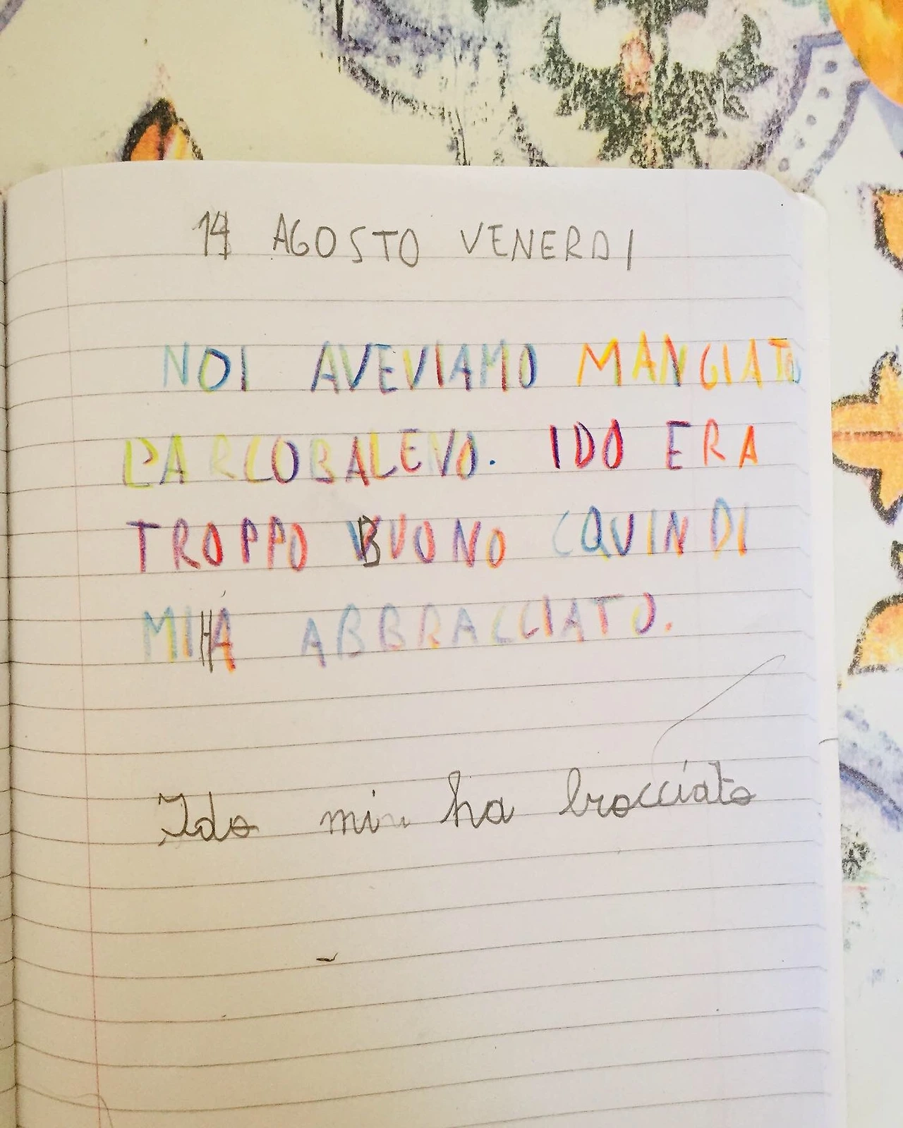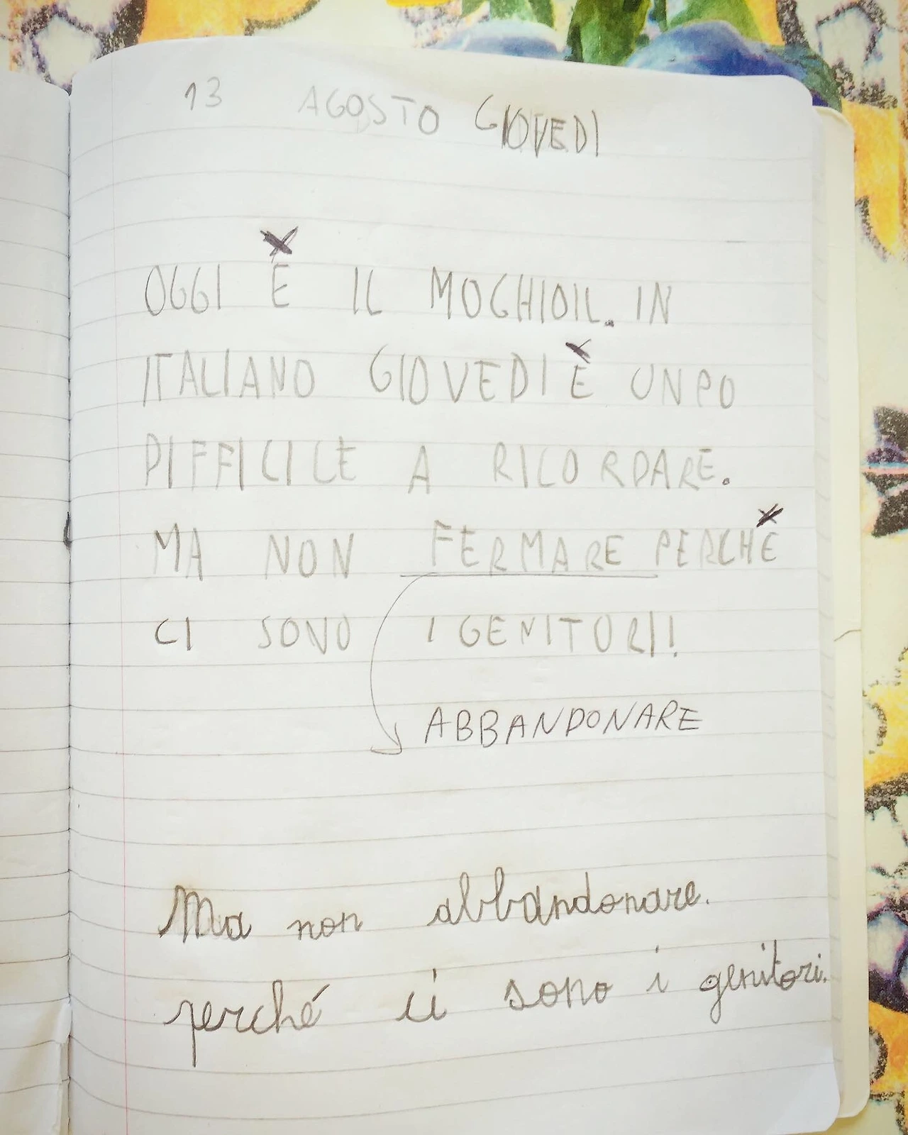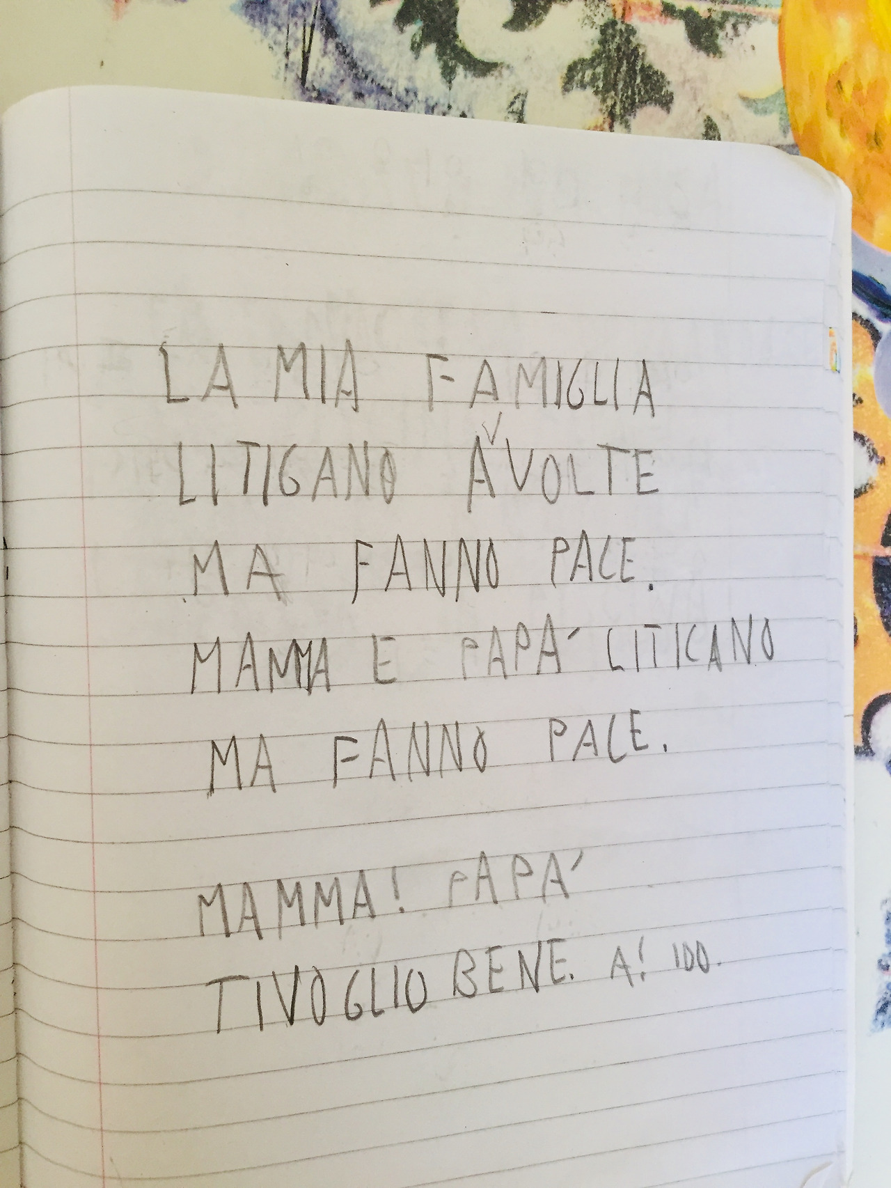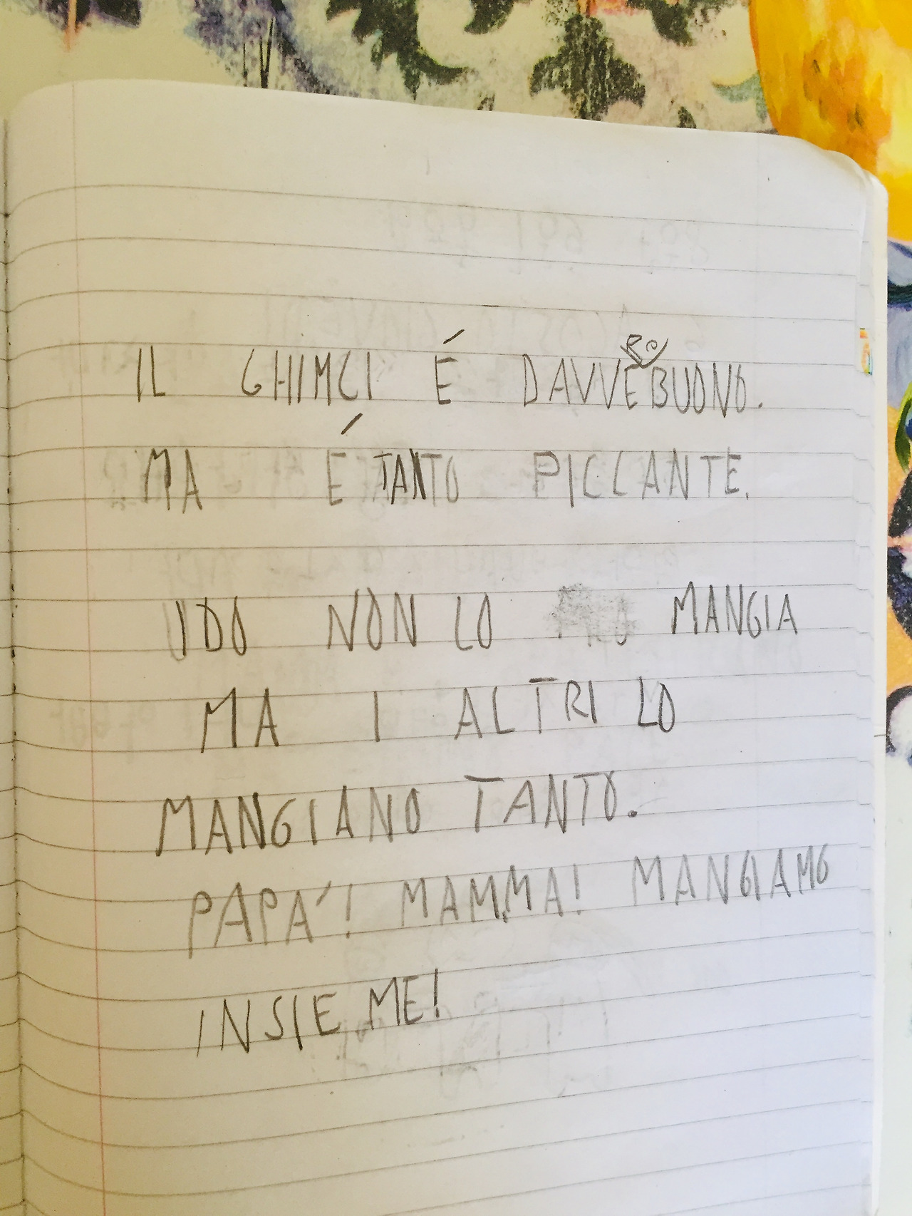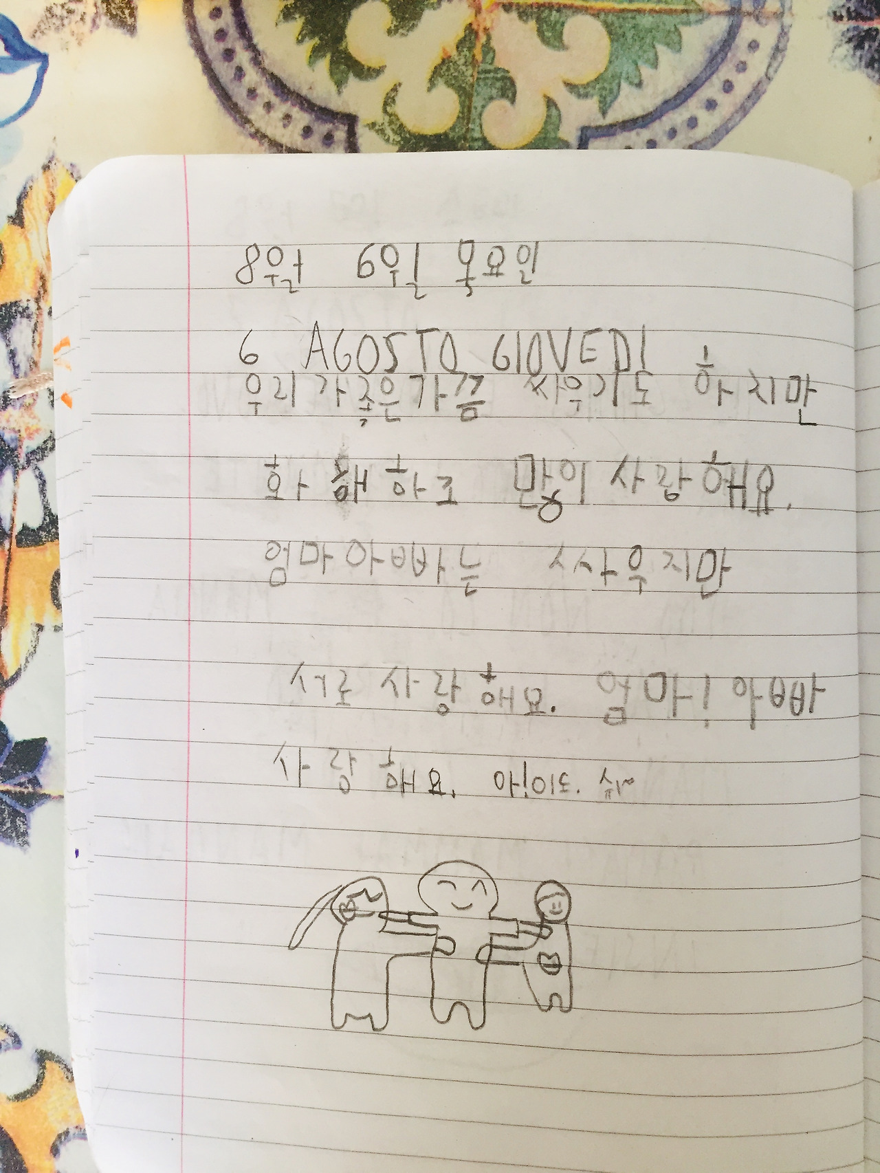 제목은 아이가 정한다. 다 쓰고 서로의 노트를 바꿔 소리 내어 읽는다. 아이는 내가 흘려 쓴 글씨가 알아보기 힘들다고 핀잔을 주기도 하고 이탈리아 작문은 지적도 한다. 난 반복해서 틀리는 맞춤법이 아닌 이상 따로 이야기 않는다.