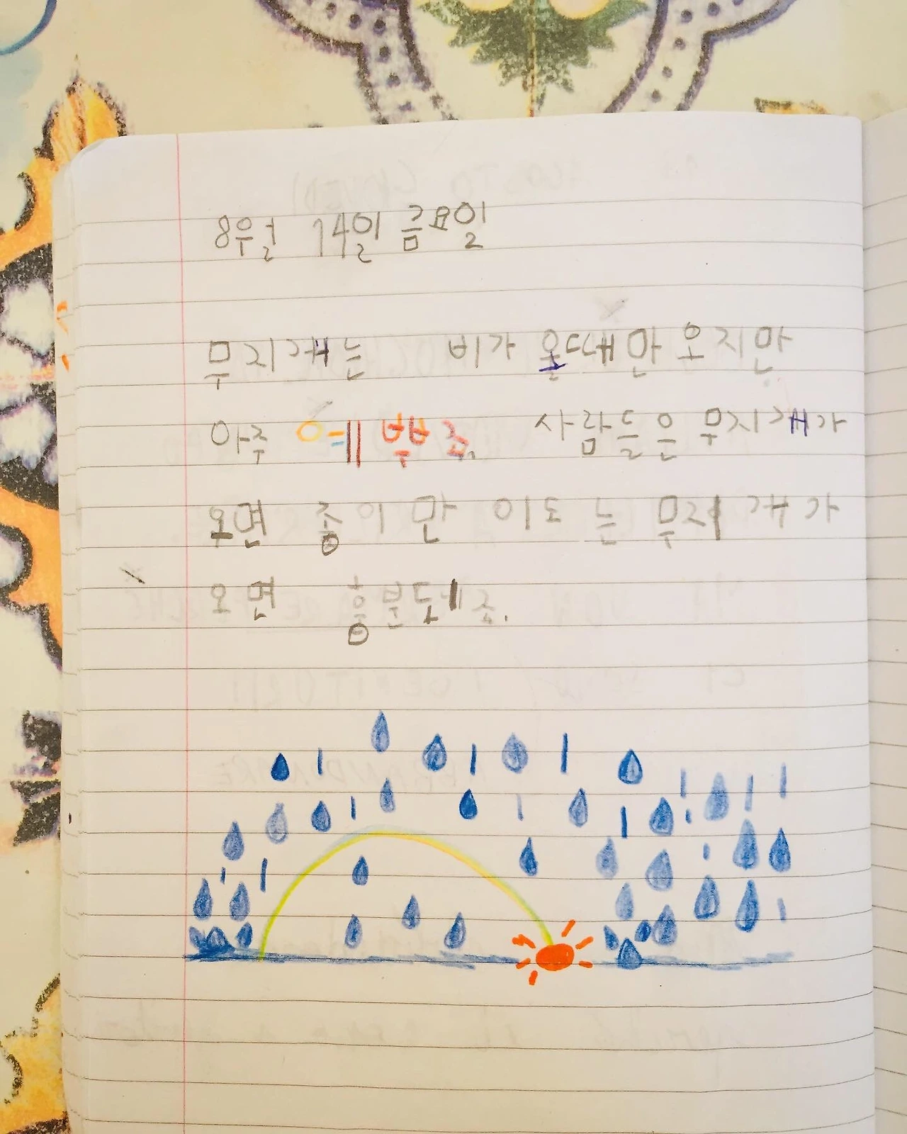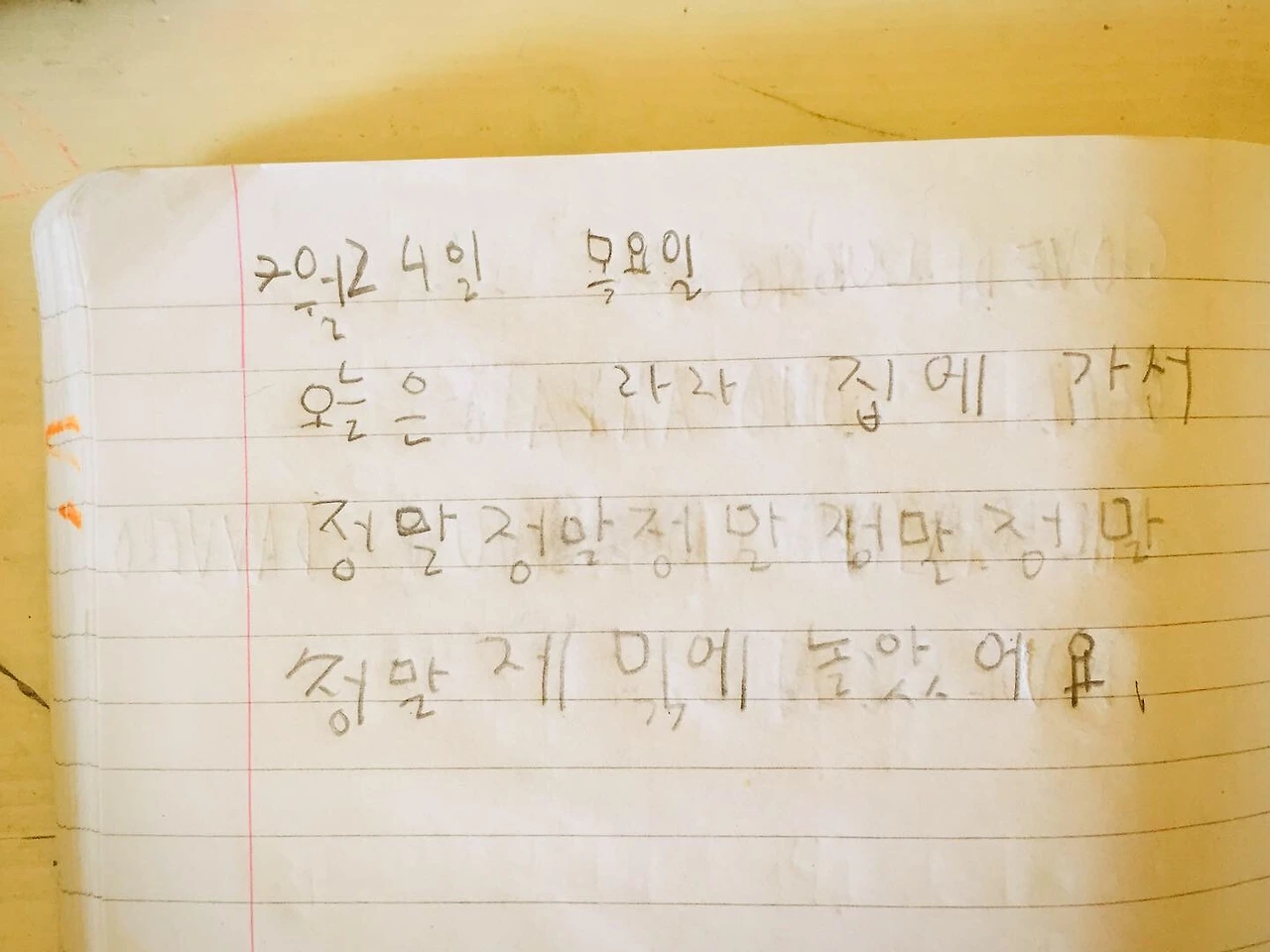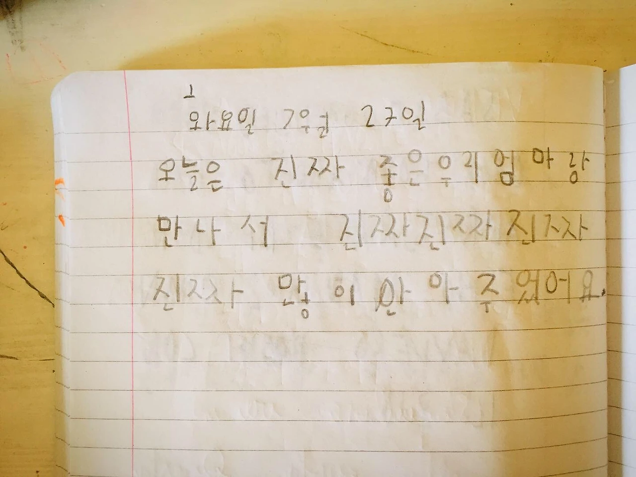 이중언어의 균형적 발전을 표방한 일기 쓰기에는 다른 이유가 더 있었다. 온라인 수업 숙제에 일주일이 나왔는데 아이가 아무리 설명을 해도 요일을 이해 못했다. 이게 다 코로나 때문이다. 월요일엔 학교를 가고 수요일엔 오후 수업까지 하고 토요일엔 한글학교 일요일엔 성당 얼마나 설명하기 쉬운가!!