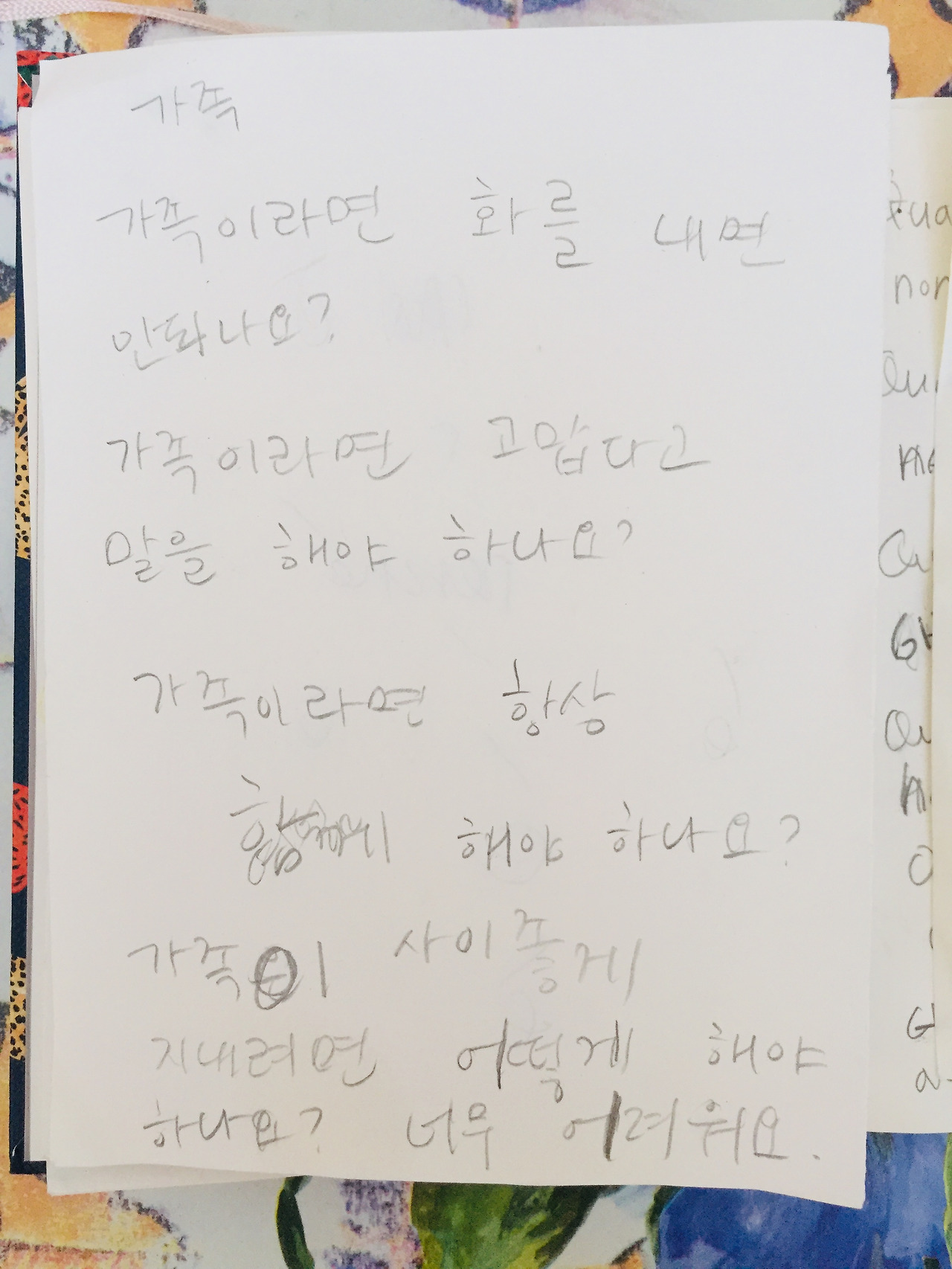 아이와 부모가 마주 앉아 쓰고 싶은 대로 틀려도 되는 시를 쓴다.