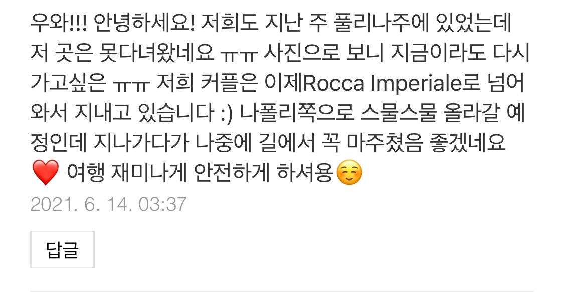 우리처럼 캠핑카로 이탈리아를 여행 중인 커플이었다. 캠핑카 여행을 하는 동안 블로그를 통해 우리의 일정을 기록하고 있었다. 매일 저녁 가족들이 잠들고 우리가 만난 해변 식당 캠핑장 등의 짧은 정보들을 복기하는 시간은 하루하루의 여행을 오래 기억하고픈 나만의 의식이었다. 그들이 연락이 왔던 그날은 마침 그들과 우리가 머무는 지역이 가까워져 있었다. 그들이 머물고 있는 칼라브리아의 작은 마을의 지명은 생소했고 애초의 우리 일정에 들어있지 않았지만 다행히 우리의 다음 목적지로 향하는 경로에서 그리 멀지 않았다. 메시지를 보자마자 답을 보냈다. 우리가 그곳으로 가겠다고.