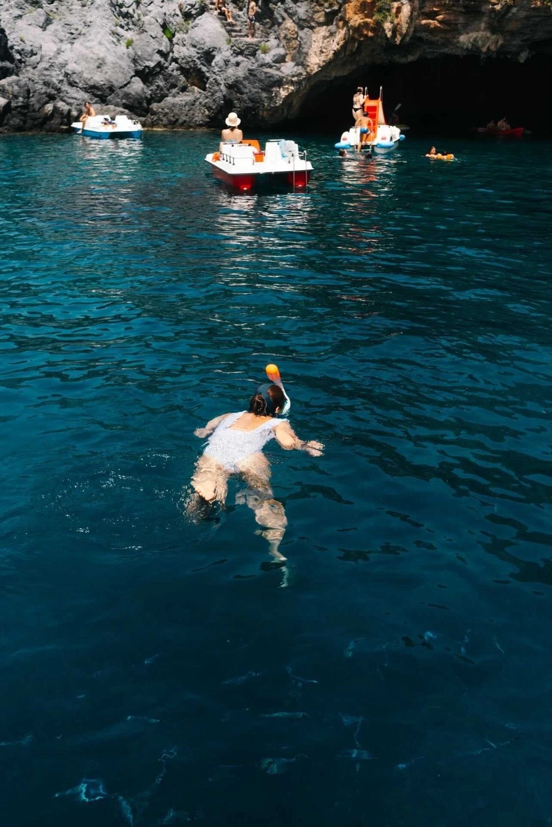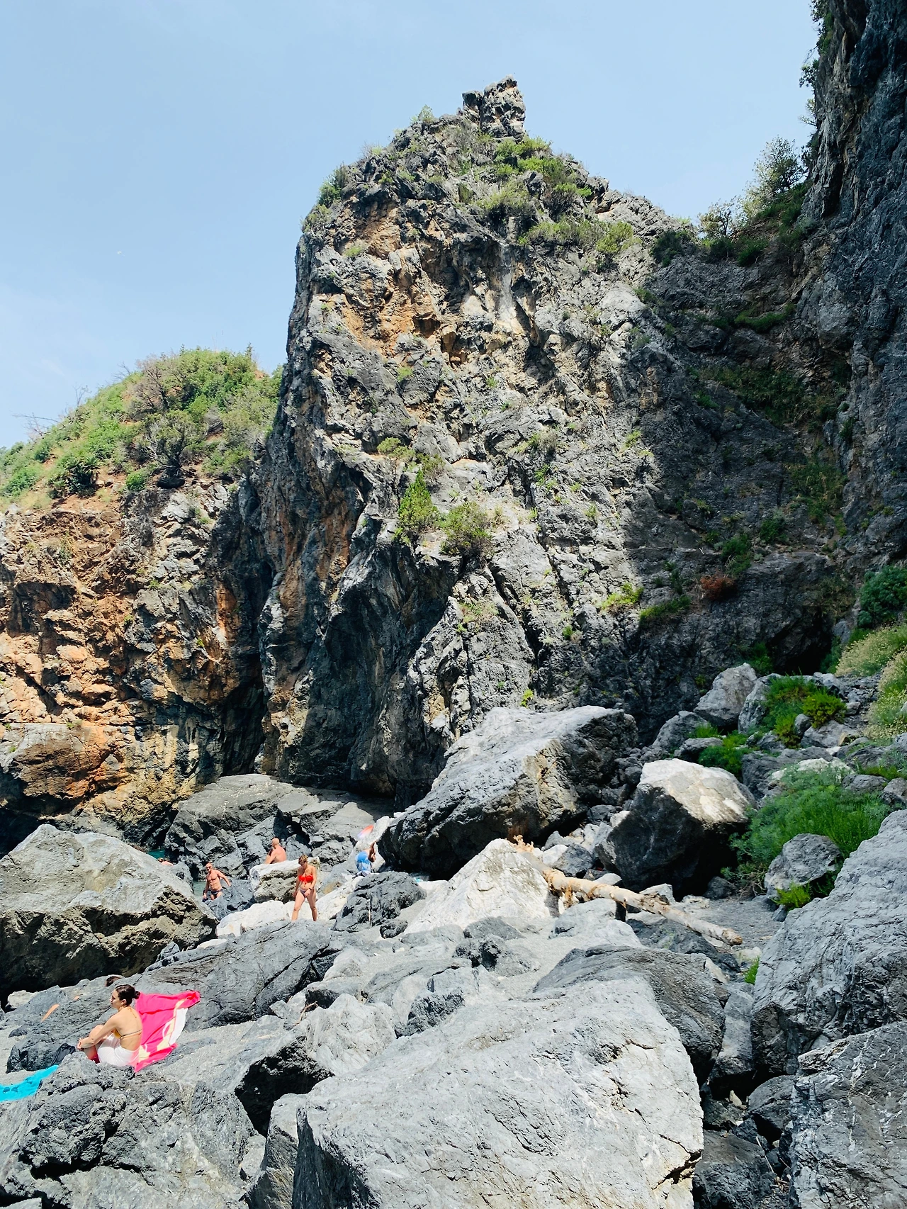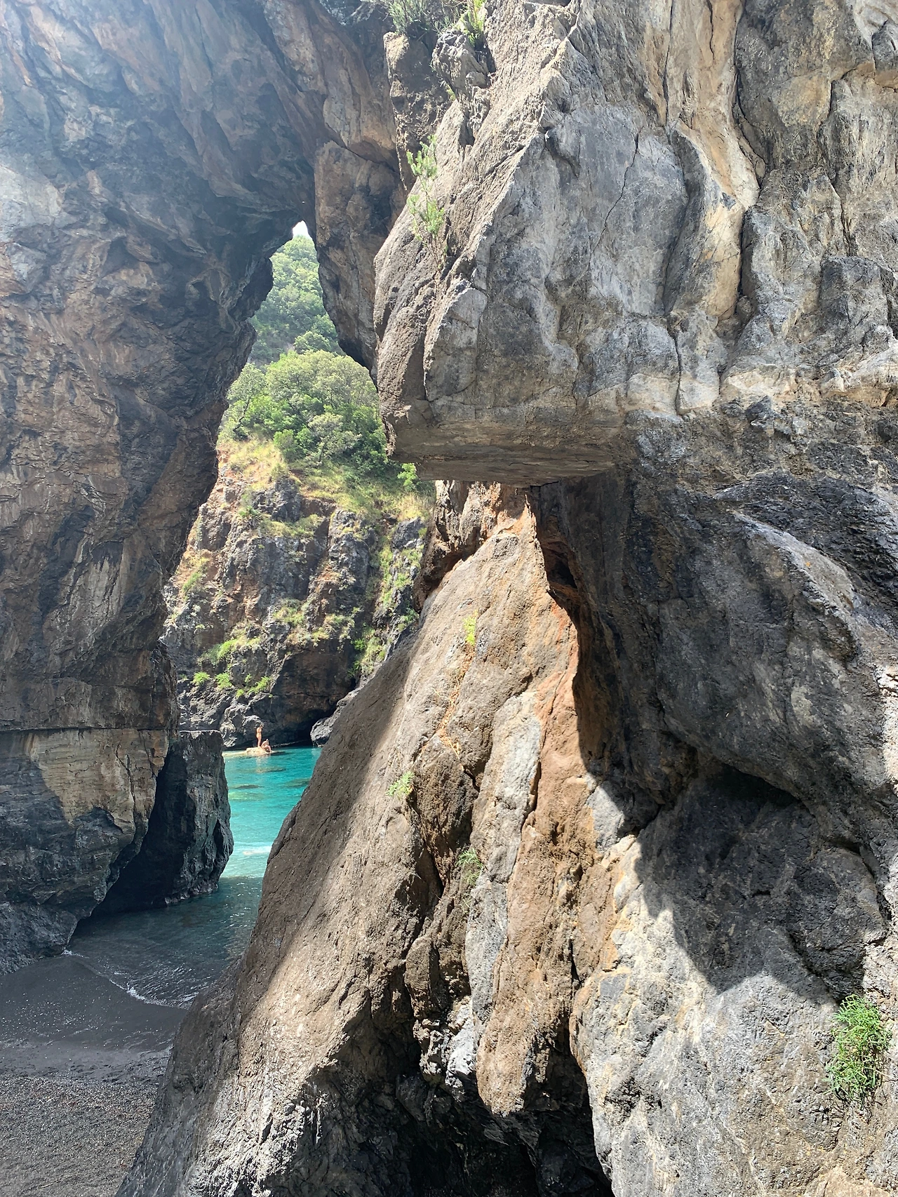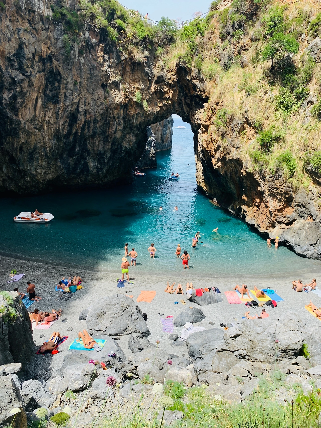 다음 날 그들의 안내를 받아 이 마을을 방문한 목적인 arcomagno해변으로 향했다. 작은 산을 넘어 숨겨진 해변을 지나 거대한 돌들을 넘고 목까지 차오르는 바다를 건너고 또 작은 산을 하나 넘자 숨이 턱 하고 막히는 눈부시도록 아름다운 풍경이 눈앞에 펼쳐졌다. 해변 이름에 걸맞게 거대한 아치 아래 숨겨진 해변이었다. 내가 이탈리아에서 마주한 가장 환상적인 모습이었다. 햇살이 아치 아래로 스며들자 바다가 마치 황금처럼 빛났다. 이곳을 맨 정신으로 마주하는 것이 불가능해 보일 지경이었다.