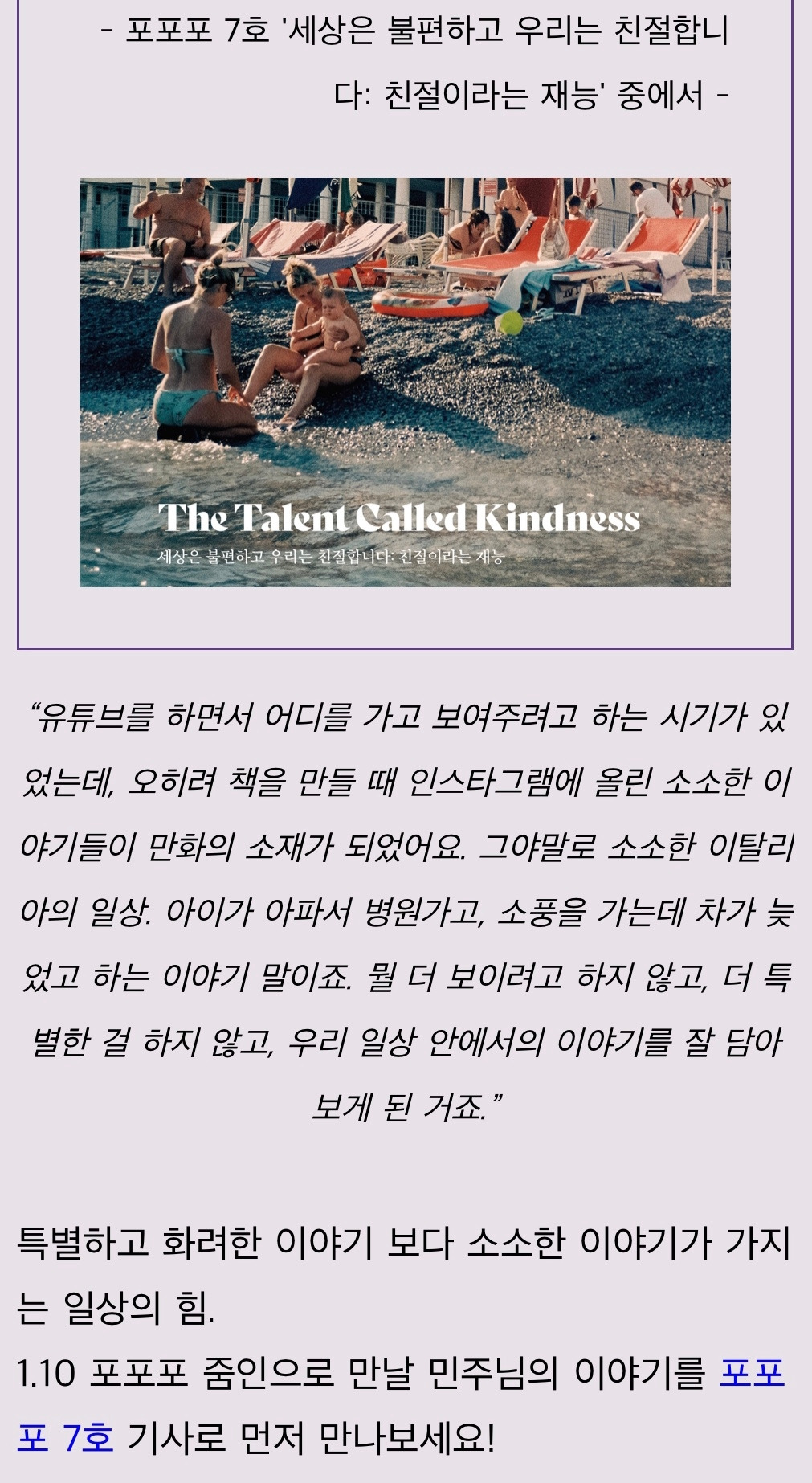 유튜브를 하면서 노출과 조회수에 온 신경이 향해있던 시점에 소소한 일상에 대한 글이 가치가 없어 보였다. 아니, 글 자체의 힘이 너무나 약해 보였다. 글 한 편에 1~2주의 에너지를 쏟는 나로선 그 시간에 차라리 다른 일을 하는 게 더 효율성이 높아 보였다.( 현실적으로도 그럴지도 모른다.) 하지만 가장 사소해 보이지만 하나하나 쌓였을 때의 힘이 가장 폭발적인 것이 글이라는 것을 깨닫고 다시 글쓰기로 돌아간다. 올해 나에겐 포포포 매거진의 원고 의뢰가 그랬다. ‘그래, 내가 쓰면서 행복한 글이 바로 이런 글이야.’ 글을 쓸 때 가장 행복하다. 내년엔 행복한 일, 더 많이 하자.