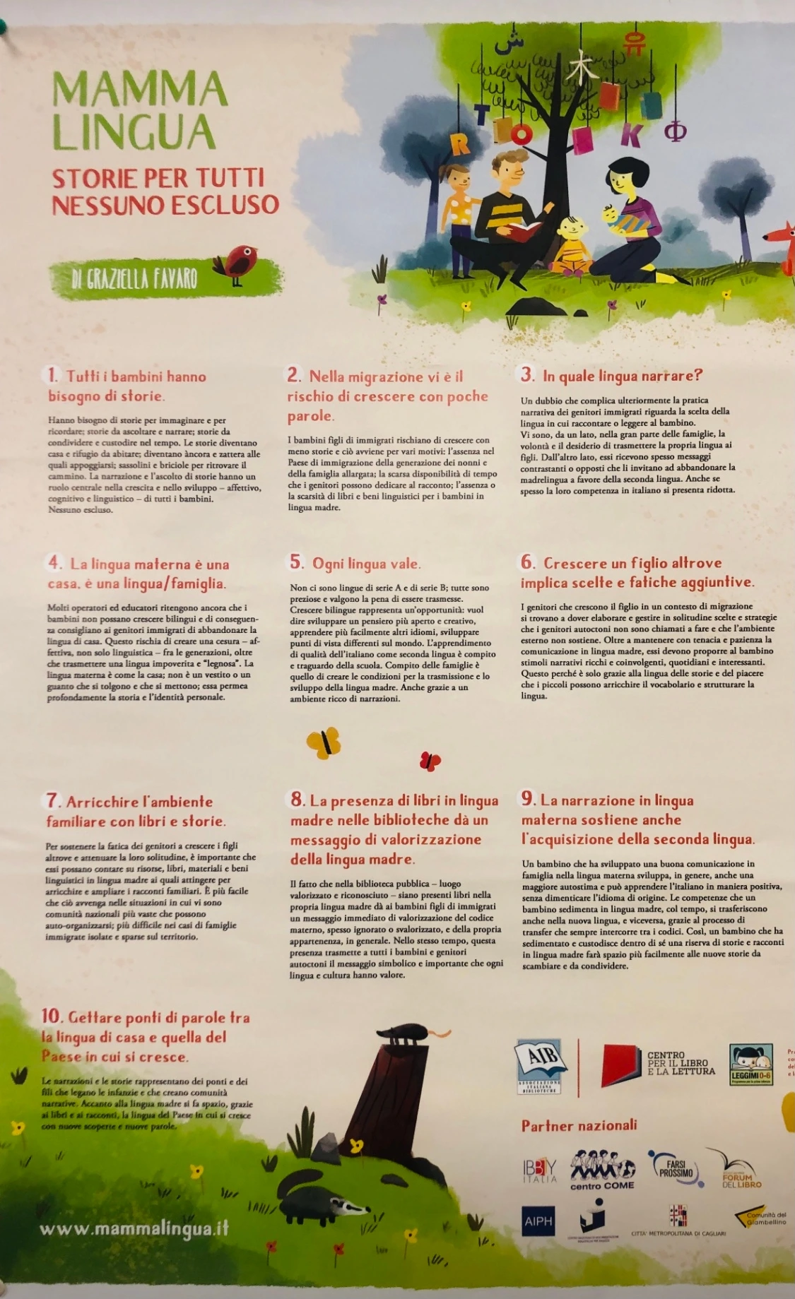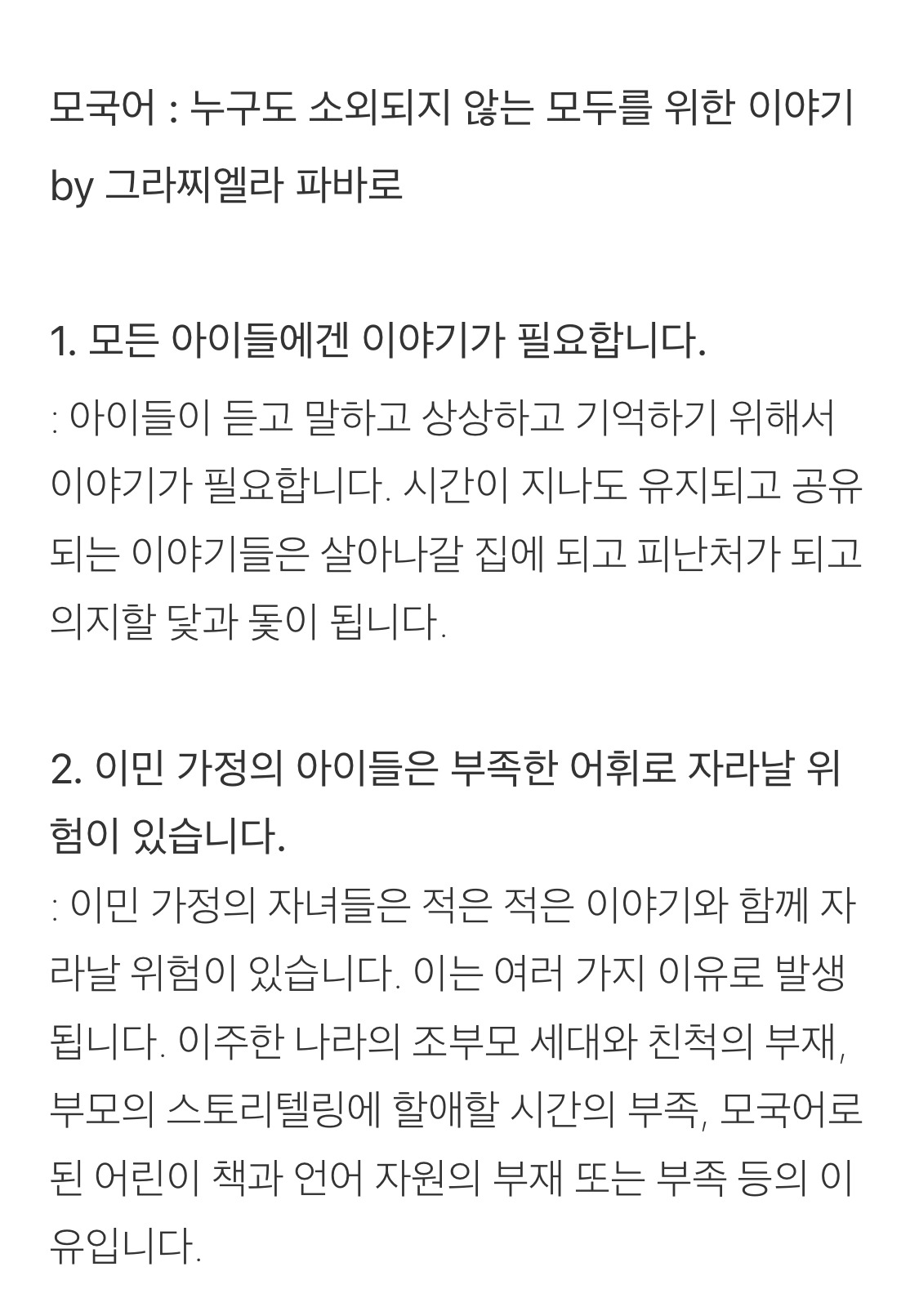 이런 생각이 깊어지던 시점에 동네 도서관에서 이중언어에 대한 글을 접히게 되었다. 그중 2번이 유독 마음에 남았다. 이민 가정의 아이들은 부족한 어휘로 자랄 위험이 있다는 내용이었는데 단순히 한국 문화의 상식이 아니라 이탈리아 상식에 있어서도 이안과 이도는 부족한 서사가 만들어질 것이다. 그건 부모가 절대 채울 수 없는지 조부모 친척들 일상 티브이 등을 통해 입김처럼 채워지는 이야기의 조각들이다.