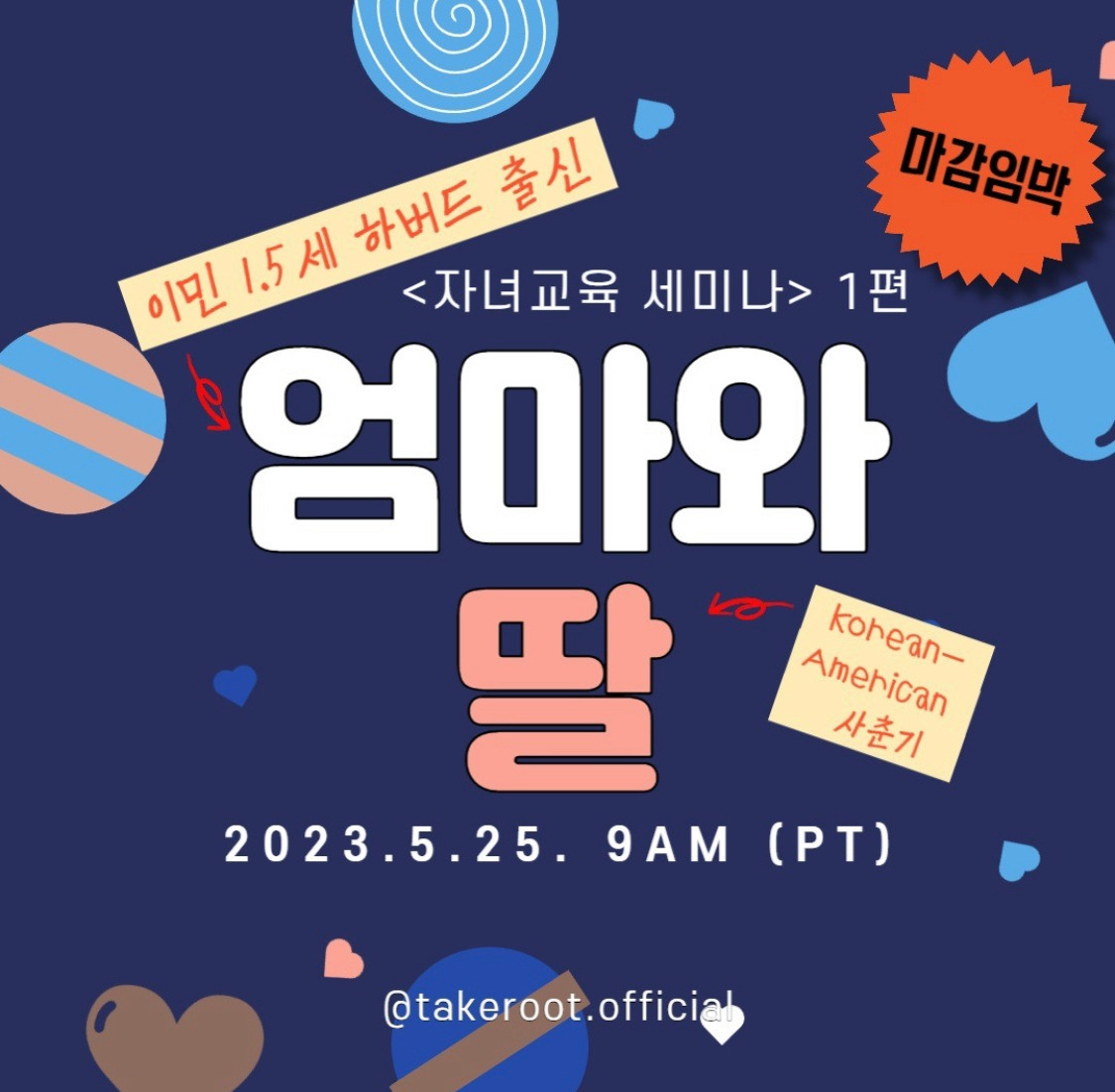 며칠 전 테이크루트(takeroot)에서 주관한 세미나를 들었다. 테이크 루트는 실리콘밸리에서 시작된 해외이주여성(엄마)을 돕는 비영리단체이다. 이민 1,5세대의 엄마와 korean_american 사춘기 아이의 정체성이라는 주제로 이윤승 작가님의 이야기를 듣는 시간이었다.