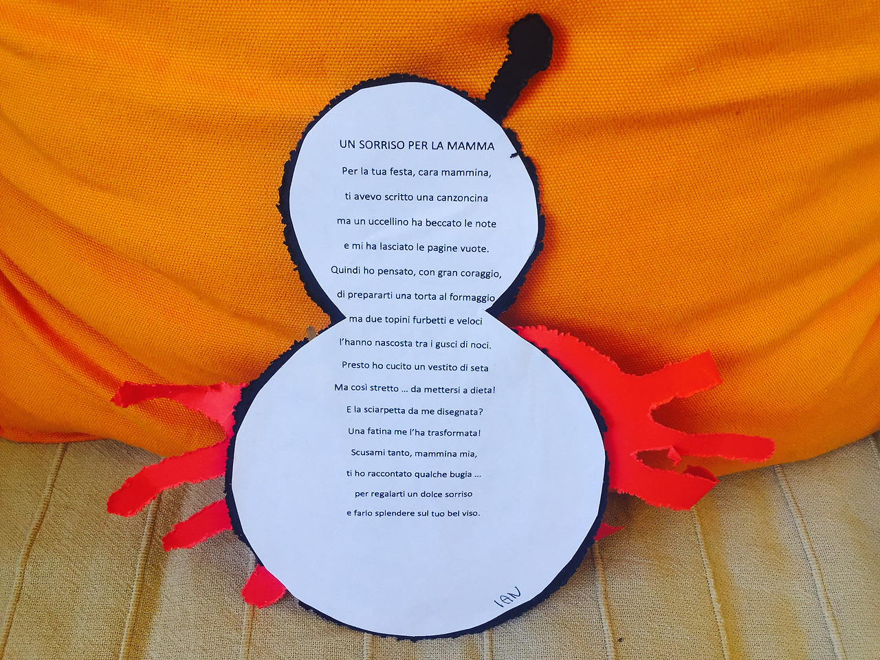 p.s. 지난 5월 13일은 festa della mamma(엄마의 날)이었다. (이탈리아는 매년 5월 둘째 주 일요일이 엄마의 날이다.) 아이는 유치원에서 작은 선물을 만들어왔고, 올해도 어김없이 시가 적혀있다. 제목은 <엄마를 위한 웃음>. 아이들은 엄마의 웃음을 위한 매일을 사는 것 같다. 웃어야 하는데 난 시를 다 읽고 나니 눈물이 났다.