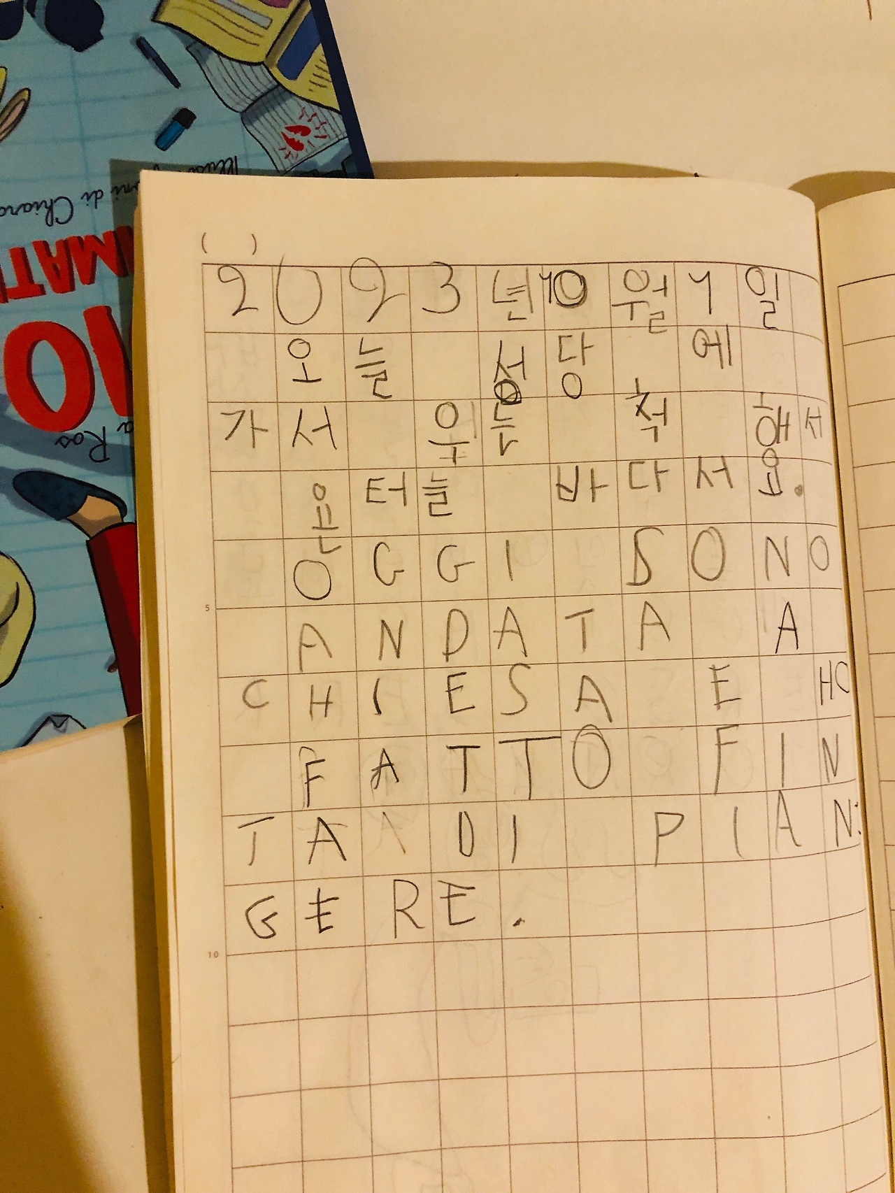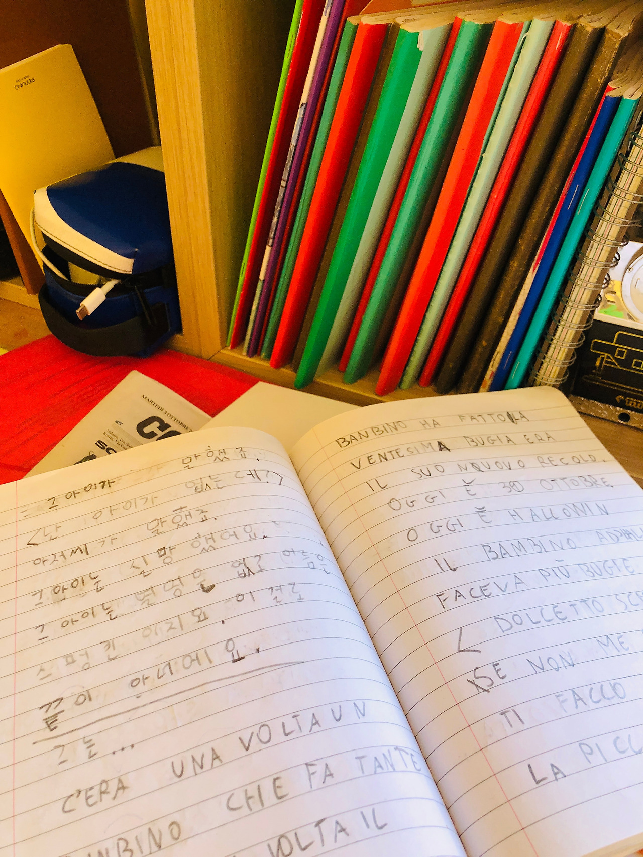 이안은 문자를 깨우친 4살부터 매일 한글/이탈리아어 일기 쓰기를 시작했다. 일기 노트들과 초3 때 쓴 소설