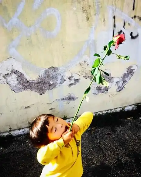 아이는 장미꽃에 그저 신이 났다.