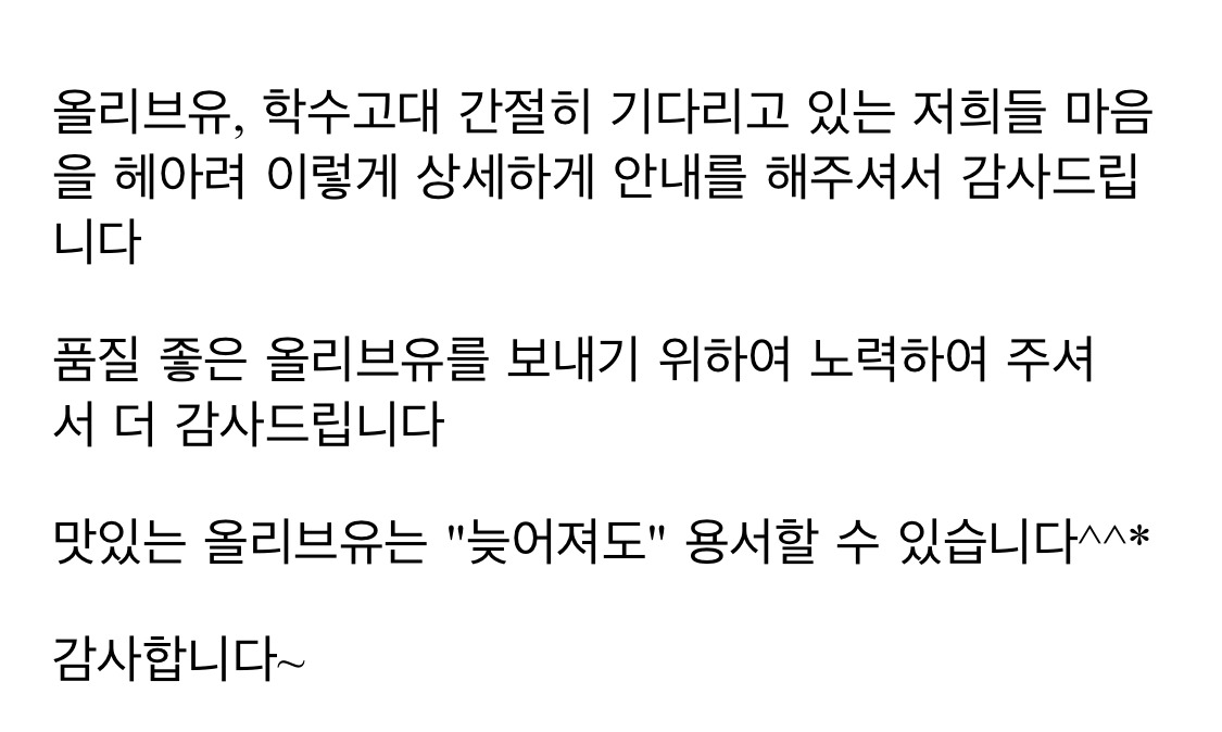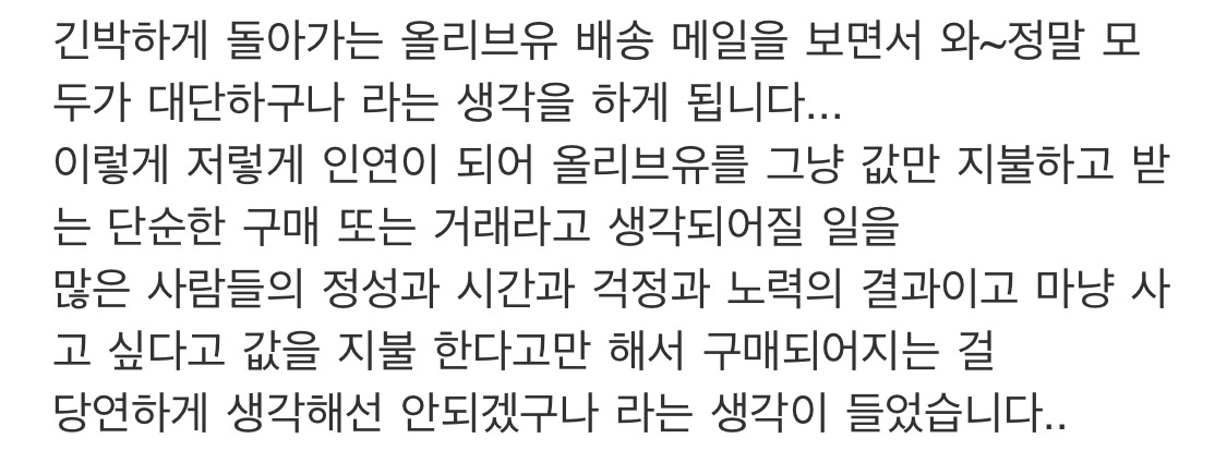 그와 별개로 발생한 문제는 해결할 수 있는 이에게 일임하고 그 밖의 문제는 고객들에게 솔직하게 실 그대로 공유하기로 했다. 지금까지 민주는 올리브유 진행에 있어 발생했던 일들을 공유하고 싶지 않았다. 자신의 무능을 고백하는 것 같아 괴로웠다. 하지만 용기를 냈다. 우선, 올리브유 배송 안내를 위한 메일을 보내며 고객들에게 진행 상황에 대해 알리고 앞으로의 일정에 대해 공지했다.