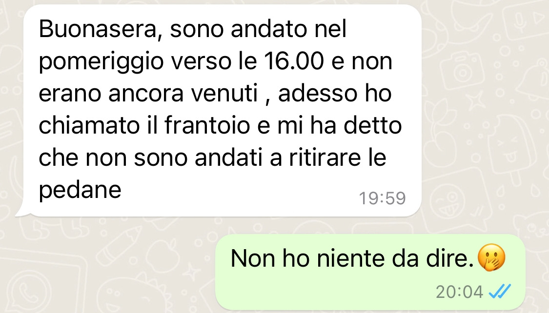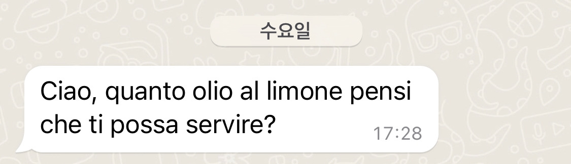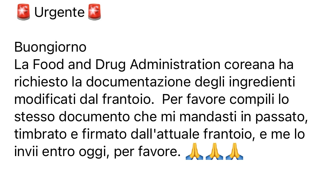아니, 대체 올리브유를 한국에 보낼 때마다 이런 일이 발생하는 거야? 진짜 딱 한번, 진짜 한 번이라도 그냥 아무런 문제 없이 진행될 수 없는 거야? 예정대로라면 지금 올리브 유는 픽업차에 실려 로마 공항으로 향해야 한다. 토요일 한국으로 향하는 항공 운송 편은 확정이 되었고 그 비행 편에 오르지 못하면 한국 검역과 통관 일정에 차질이 생겨 크리스마스 전에 고객들에게 올리브유를 발송할 수 없다. 그런데 지금 내가 읽고 있는 문자는 대체 무슨 소릴 하고 있는 거지? 나 지금 아주 지독한 엿먹이기 악몽 속에서 깨지 못하고 있는 거야?