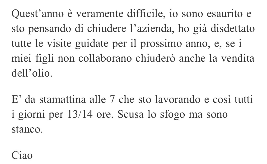 올해는 정말 힘들고 지쳐서 회사를 닫을까 생각 중이고 이미 내년 올리브 농장 투어 다 취소했어. 만약 우리 아이들이 도와주지 않는다면 올리브 유 판매도 그만할지도 몰라.
