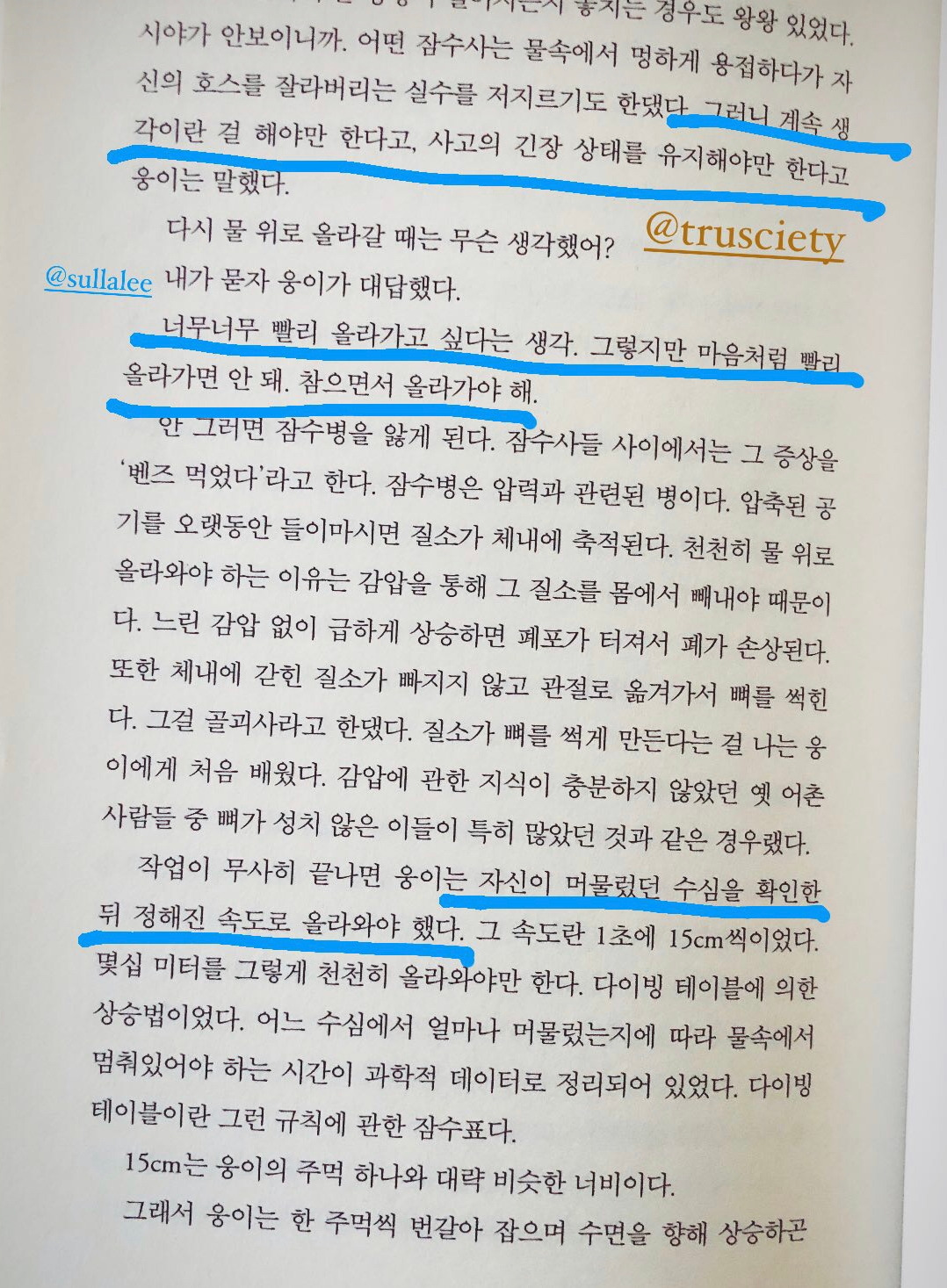 잠수사의 작업이 끝난 후 머물렀던 수심을 확인해 정해진 속도로 올라가야 한다. 어느 수심에서 얼마나 머물렀는지에 따라 물속에서 멈춰있어야 하는 시간이 달라진다. 글 속에는 너무너무 빨리 올라가고 싶지만 초당 15cm의 속도로 상승하는 웅이 그려진다.