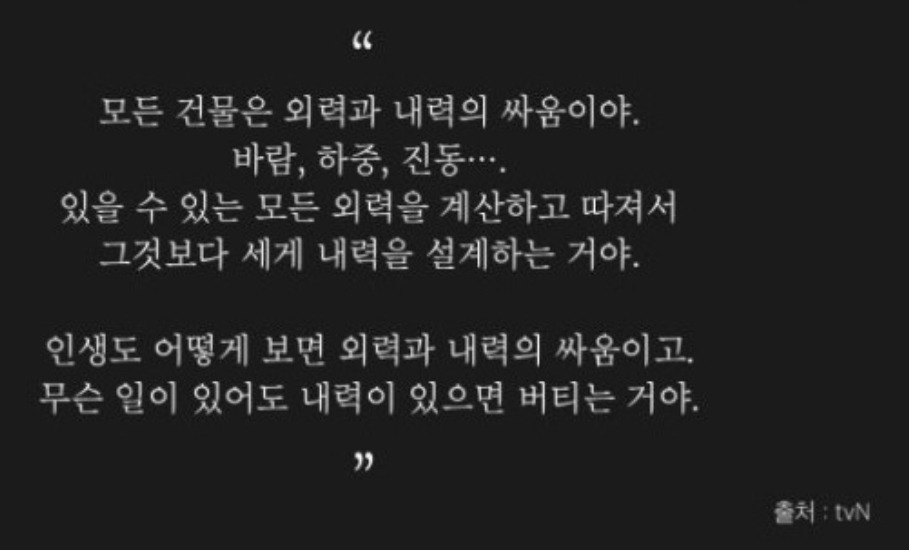 드라마 나의 아저씨에서 삶이란 외력과 내력의 싸움이라는 대사가 나온다. 수영장에서 동전을 줍고 바닷속의 전복을 따고,