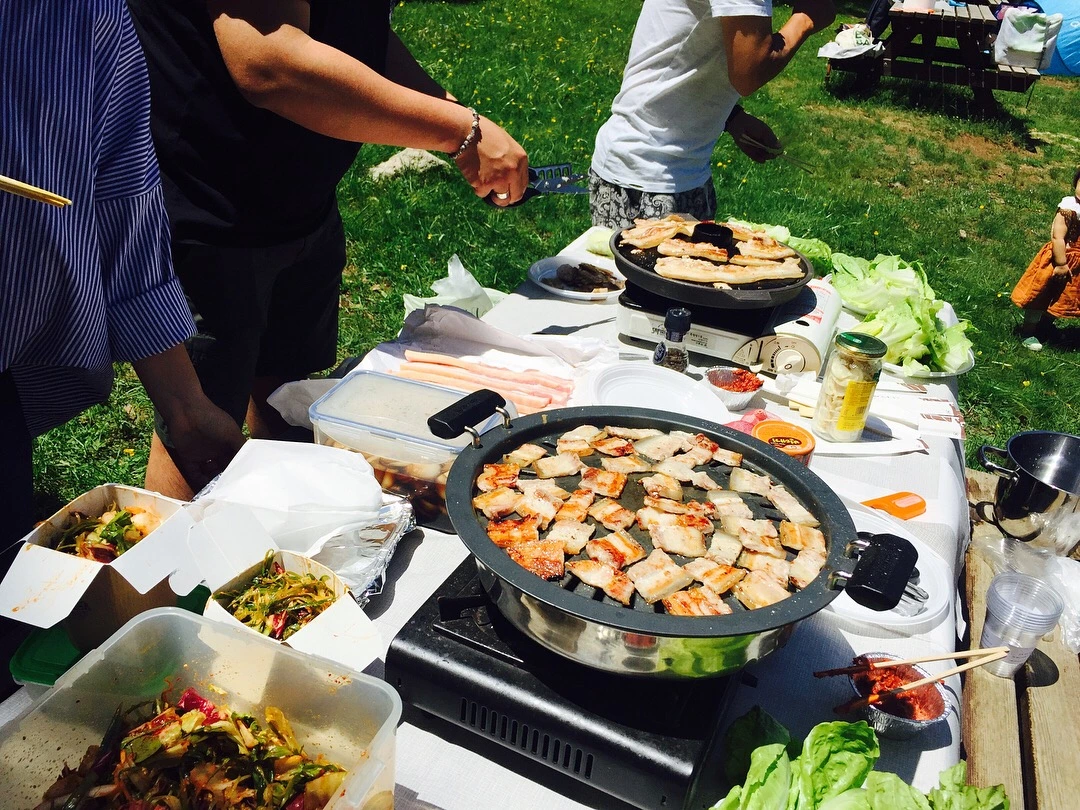 우리 일행은 산길 초입에 마련된 피크닉 공간에 자리를 잡았다. 바비큐 시설이 따로 없어서 챙겨 온 버너에 솥뚜껑을 올렸다. 남편이 몇 년 전 로마 어디에서 솥뚜껑을 구해왔다. 그 위에 고기를 구울 때면 유난스럽다 핀잔을 줬는데 이렇게 빛을 발한다. 이건 분명한 칭찬 감이다.