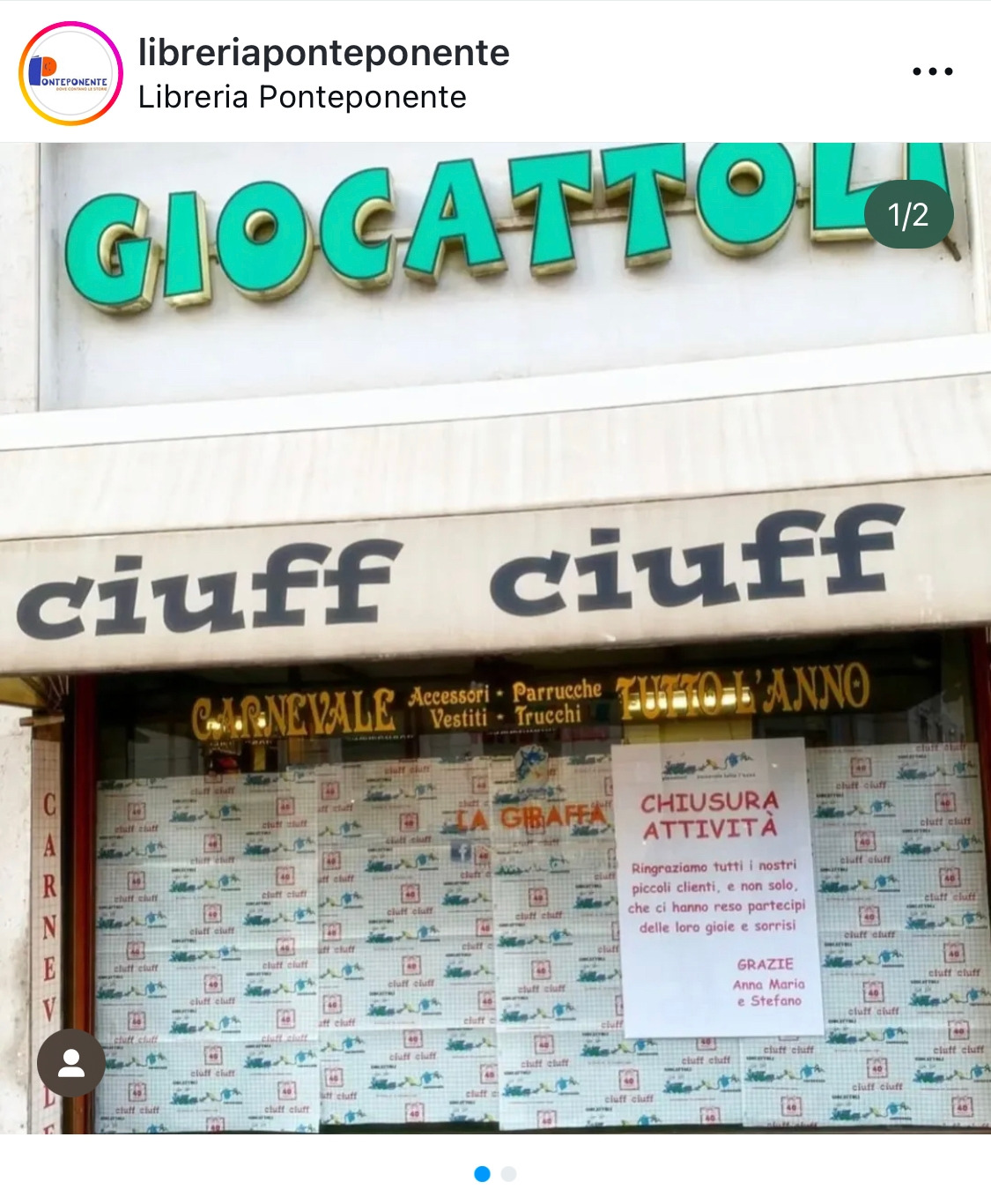 Nella volta di poche settimane, nel nostro quartiere, chiudono due storici negozi di giocattoli: Casa Mia e Ciuff Ciuff. Attività commerciali che son state aperte per tempo sufficiente da attraversare ben più di una generazione, quasi ottant'anni l'una e quarantacinque l'altra.