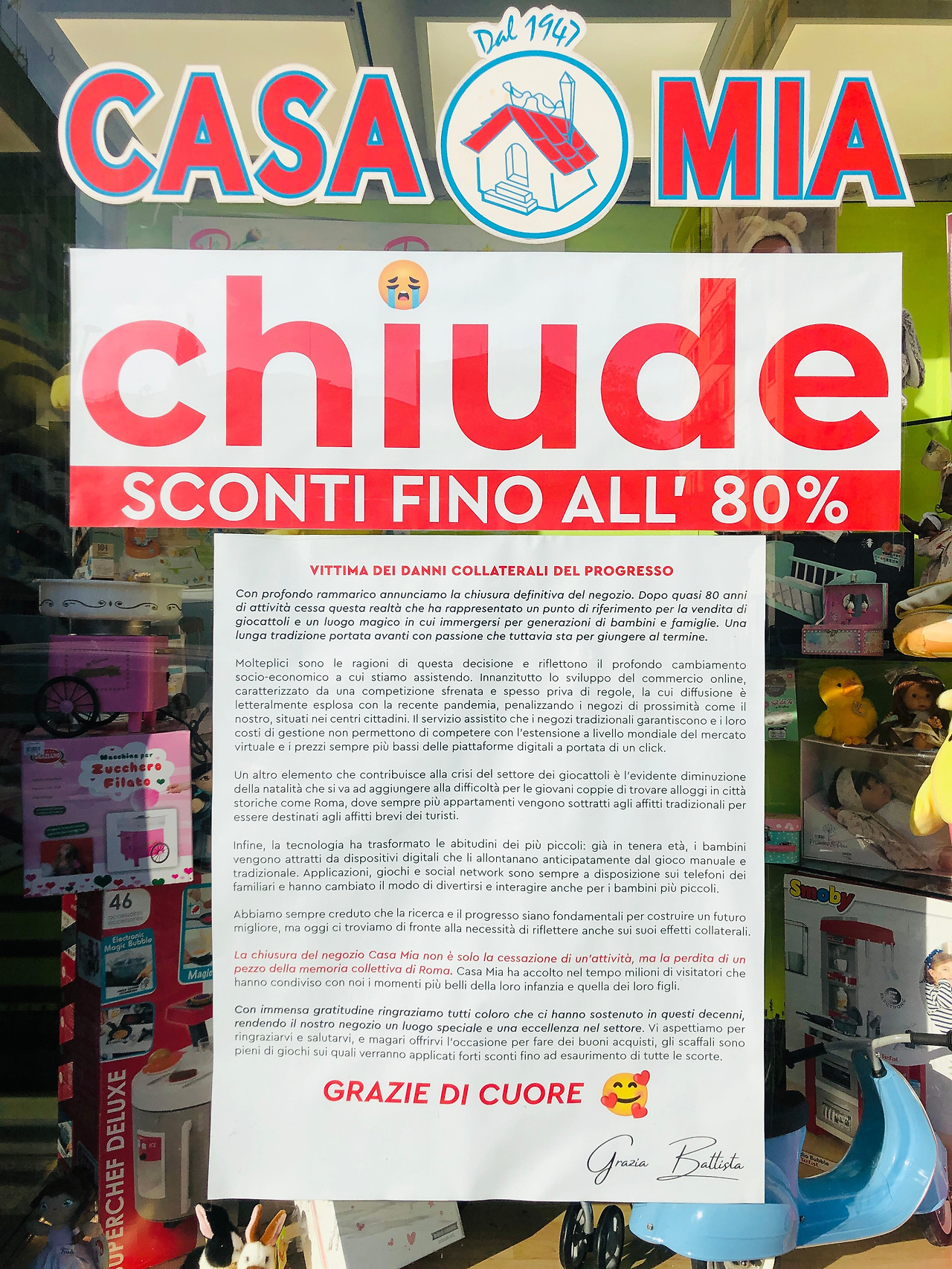 La chiusura del negozio Casa Mia non è solo la cessazione di un'attività, ma la perdita di un pezzo della memoria collettiva di Roma. Casa Mia ha accolto nel tempo milioni di visitatori che harino condiviso con noi i momenti più belli della loro infanzia e quella dei loro figli.
