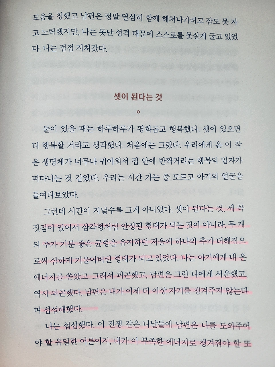 그런데 이게 다가 아니다. 가장 민망한 부분이 남았으니 이름하여 유.축.기. 이 망할 놈의 기계가 최고였다. 기계가 가슴을 쥐어짜니 아프기도 더럽게 아플뿐더러, 이 비주얼은 대체 뭐란 말인가. 그 요상한 것들이 내 가슴에 달려 펌프질을 하고 있을 때면 이 민망한 장면을 견딜 수 없어 내게서 홀연히 빠져나가려는 멘털을 잘 붙잡아야 했다. (69쪽 수유:나는 가슴이 달린 채 존재한다. 고로? 中)